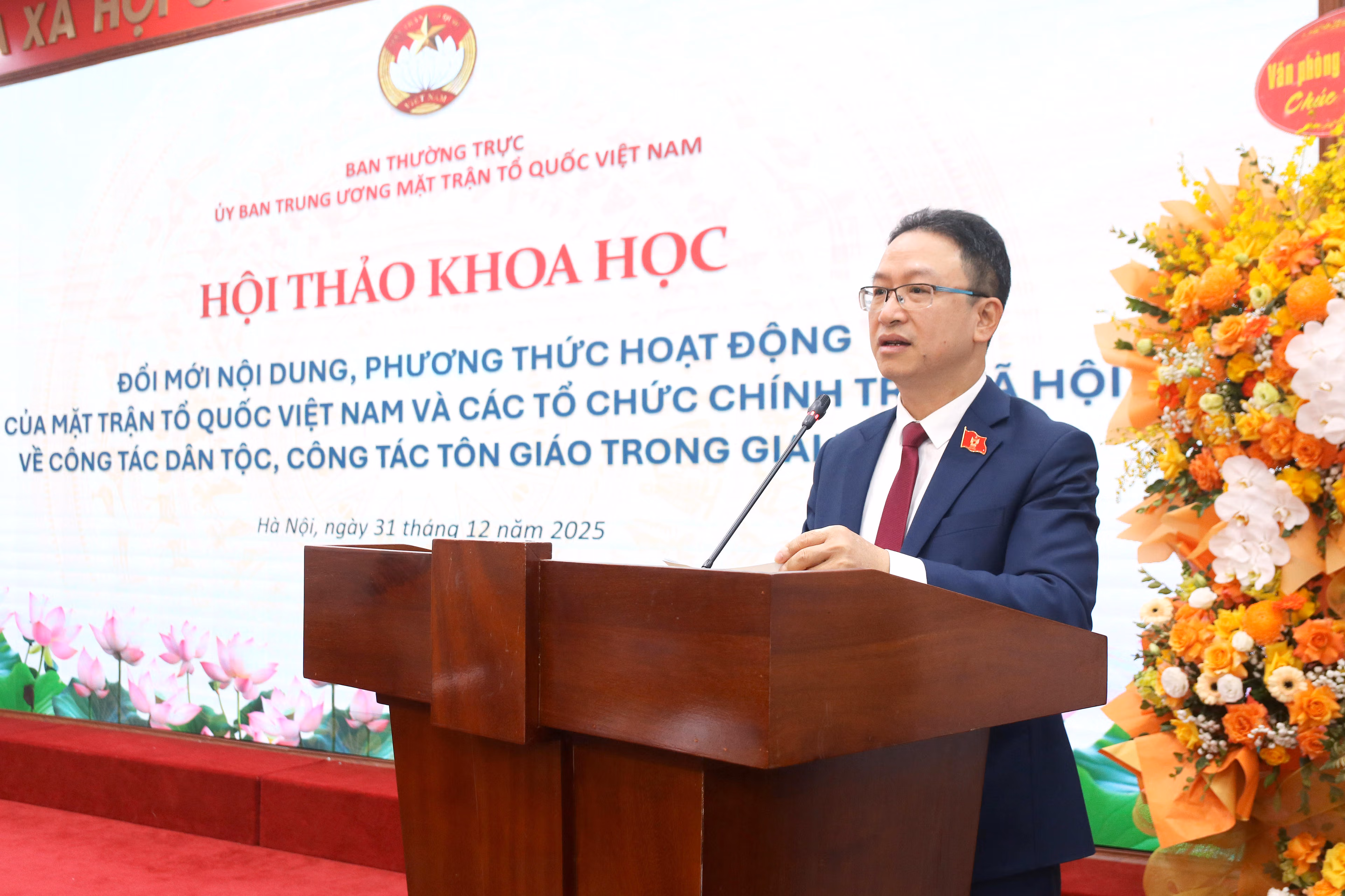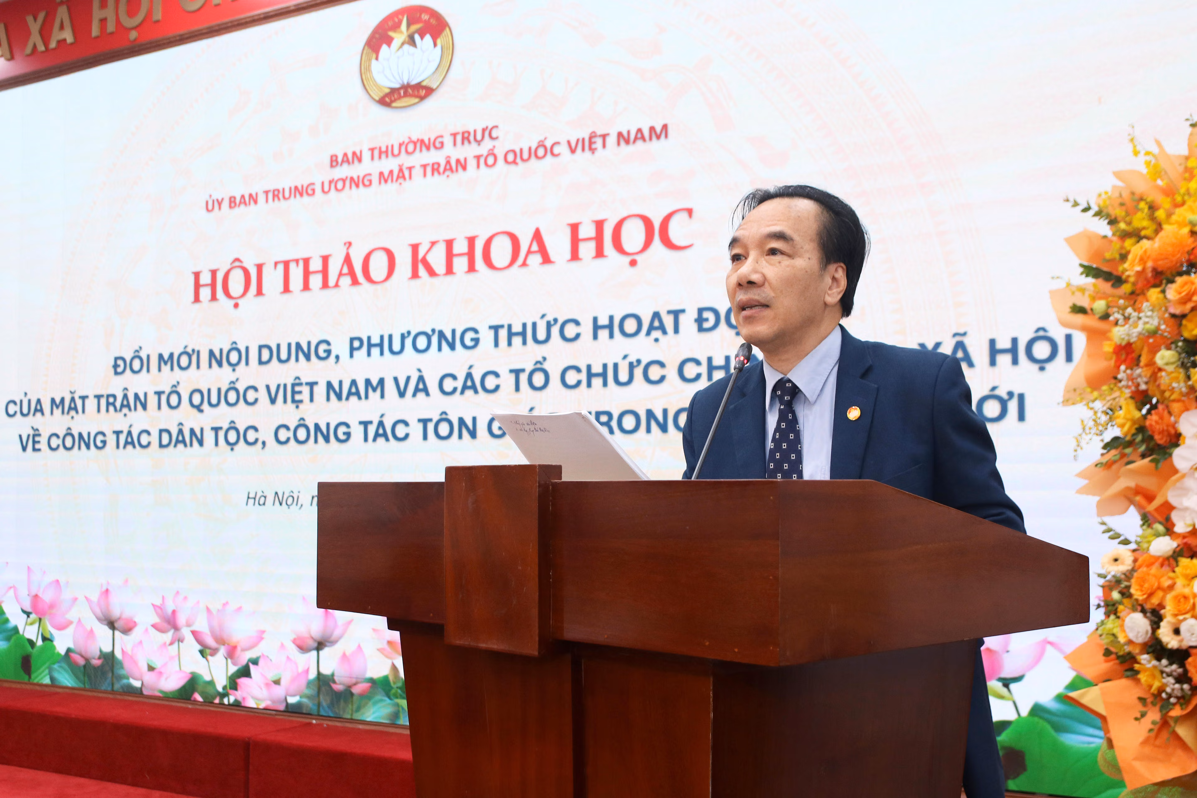 Phát biểu đề dẫn Hội thảo, TS Nguyễn Văn Thanh, Trưởng ban Dân tộc và Tôn giáo Cơ quan UBTƯ MTTQ Việt Nam cho biết, Hội thảo có ý nghĩa lý luận, thực tiễn quan trọng, nhằm giúp Ban Thường trực và Đoàn Chủ tịch tổng kết, đánh giá khách quan, toàn diện kết quả công tác dân tộc, công tác tôn giáo của MTTQ Việt Nam trong 10 năm qua và xây dựng, ban hành Kết luận mới của Đoàn Chủ tịch về việc đổi mới nội dung, phương thức hoạt động của MTTQViệt Nam, các tổ chức chính trị - xã hội trong công tác dân tộc, tôn giáo giai đoạn mới, phù hợp với yêu cầu của đất nước trong kỷ nguyên mới và vai trò nòng cốt chính trị của MTTQ Việt Nam, các tổ chức chính trị - xã hội trong việc phát huy dân chủ, đại diện và bảo vệ quyền, lợi ích hợp pháp của các tầng lớp nhân dân, các dân tộc, các tôn giáo và người Việt Nam ở nước ngoài theo tinh thần Nghị quyết Đại hội XIII của Đảng; phù hợp với mô hình tổ chức bộ máy mới của Cơ quan UBTƯ MTTQ Việt Nam theo Quyết định số 304 của Bộ Chính trị sau khi sắp xếp, đưa các tổ chức chính trị - xã hội về trực thuộc MTTQ Việt Nam.
