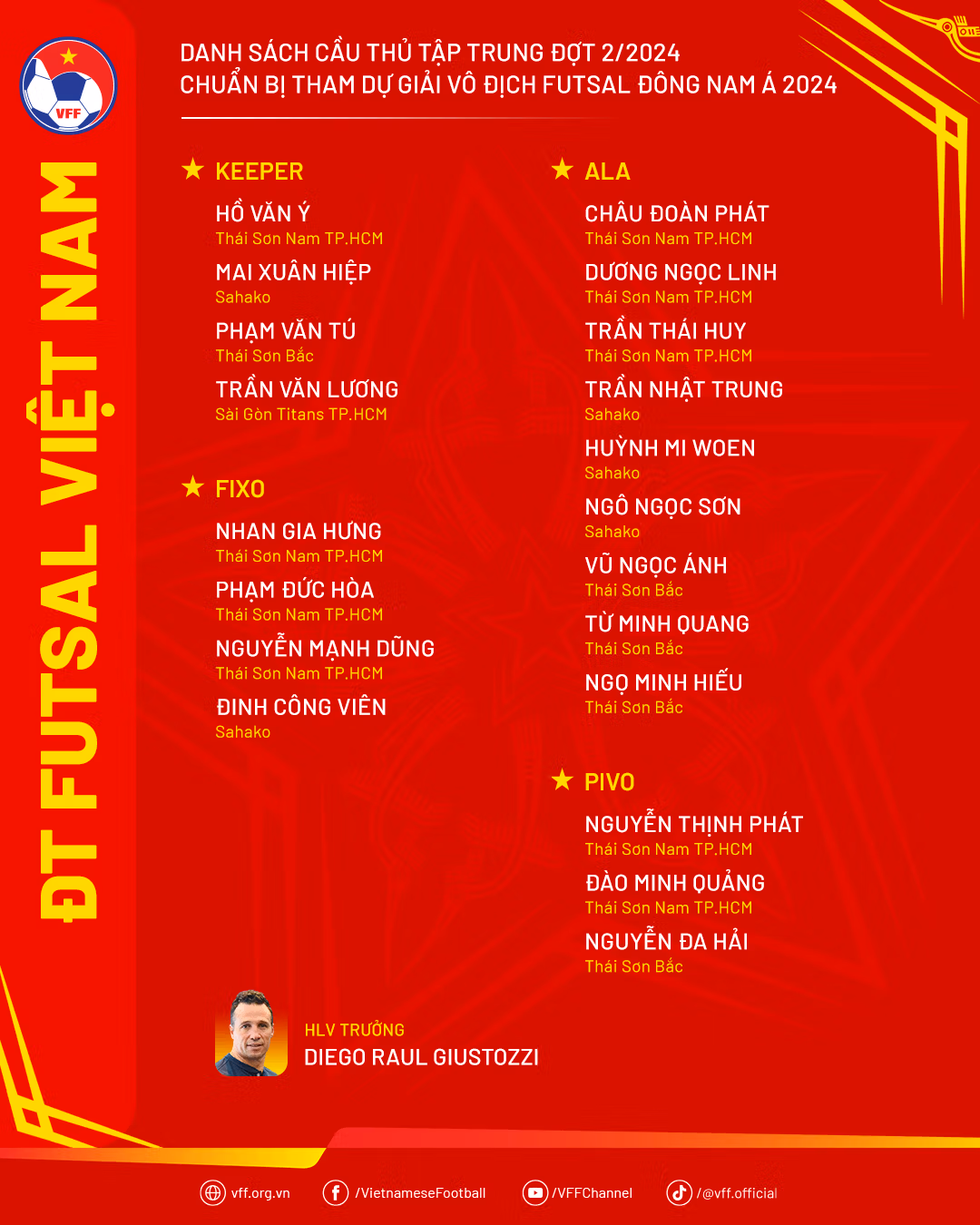 Theo tin từ Liên đoàn bóng đá Việt Nam, ngày 10/10, đội tuyển futsal Việt Nam dưới sự dẫn dắt của HLV trưởng Diego Raul Giustozzi đã hội quân trở lại tại TP HCM, chính thức bước vào kế hoạch chuẩn bị tham dự Giải vô địch futsal Đông Nam Á 2024.