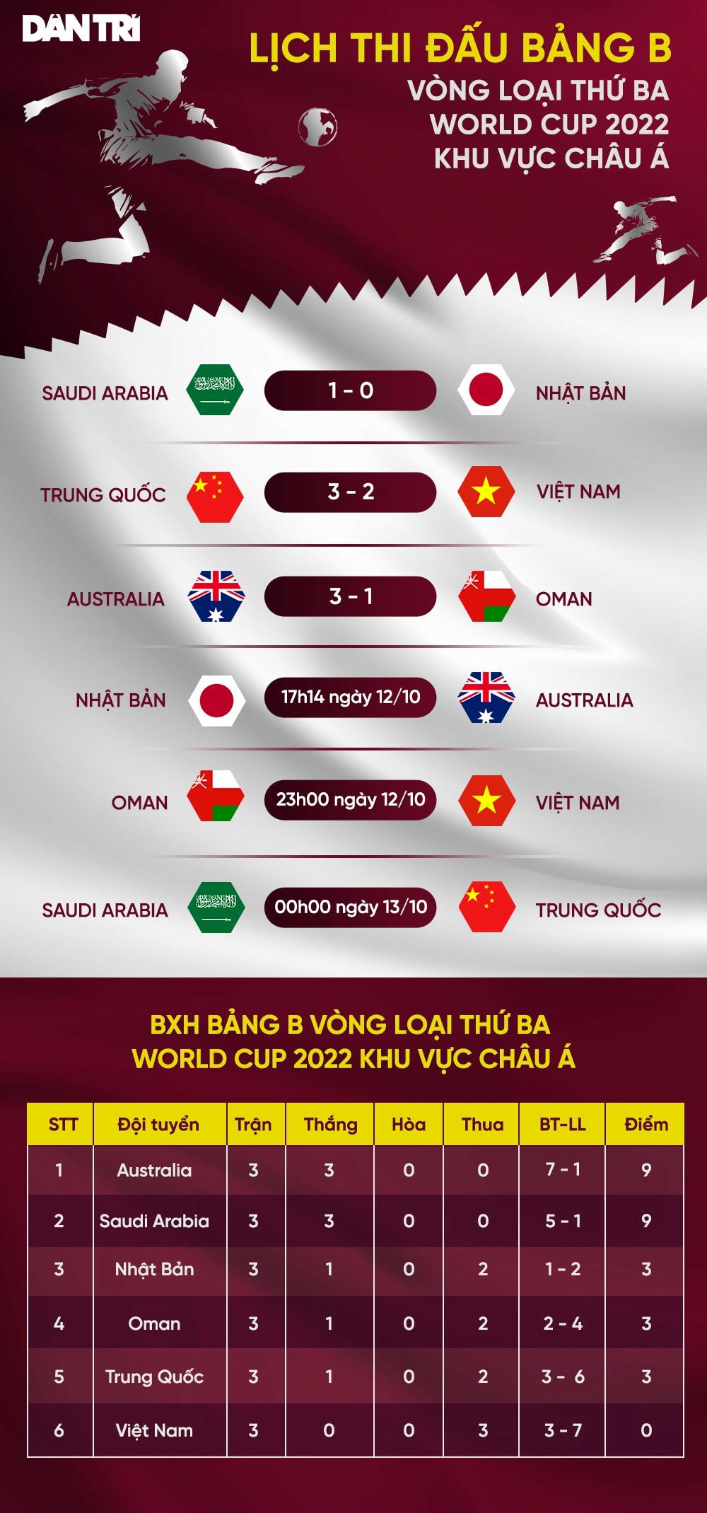 Đội tuyển Việt Nam vẫn chưa có được điểm nào sau ba trận toàn thua trước Saudi Arabia, Australia và Trung Quốc. Điều đó khiến cho đoàn quân của HLV Park Hang Seo chôn chân ở vị trí cuối bảng.