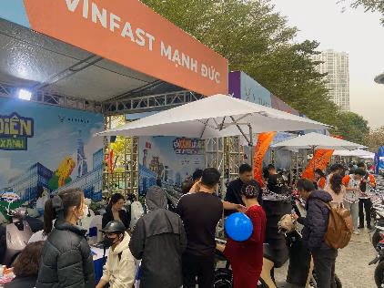 Ngay từ sáng 31/1, bất chấp trời mưa, không khí tại Công viên Thanh Xuân (Hà Nội) - nơi diễn ra sự kiện “Đổi xăng lấy điện - Cùng VinFast kiến tạo tương lai xanh” do VinFast tổ chức từ 31/1 tới 1/2 - vẫn vô cùng sôi động. Khu vực tư vấn, lái thử luôn trong trạng thái kín chỗ trong khi rất đông khách hàng đã chuẩn bị sẵn xe xăng cũ để được định giá và sẵn sàng lên đời xe điện luôn trong ngày.