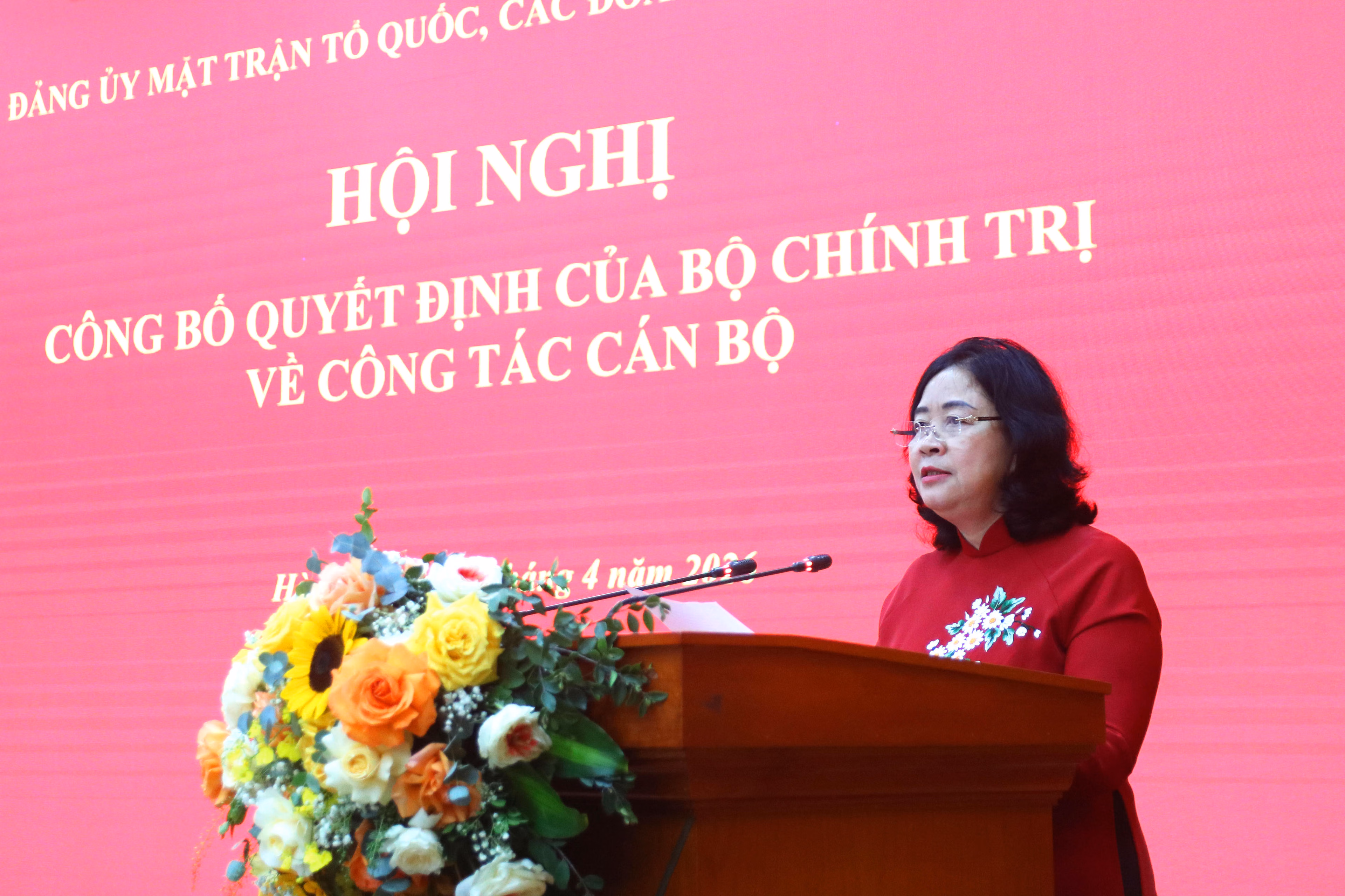Chiều 8/4, tại Hà Nội, Đảng ủy MTTQ, các đoàn thể Trung ương tổ chức Hội nghị công bố Quyết định của Bộ Chính trị về công tác cán bộ. Đồng chí Bùi Thị Minh Hoài - Ủy viên Bộ Chính trị, Bí thư Trung ương Đảng, Bí thư Đảng ủy MTTQ, các đoàn thể Trung ương, Chủ tịch UBTƯ MTTQ Việt Nam dự và phát biểu chỉ đạo tại Hội nghị.