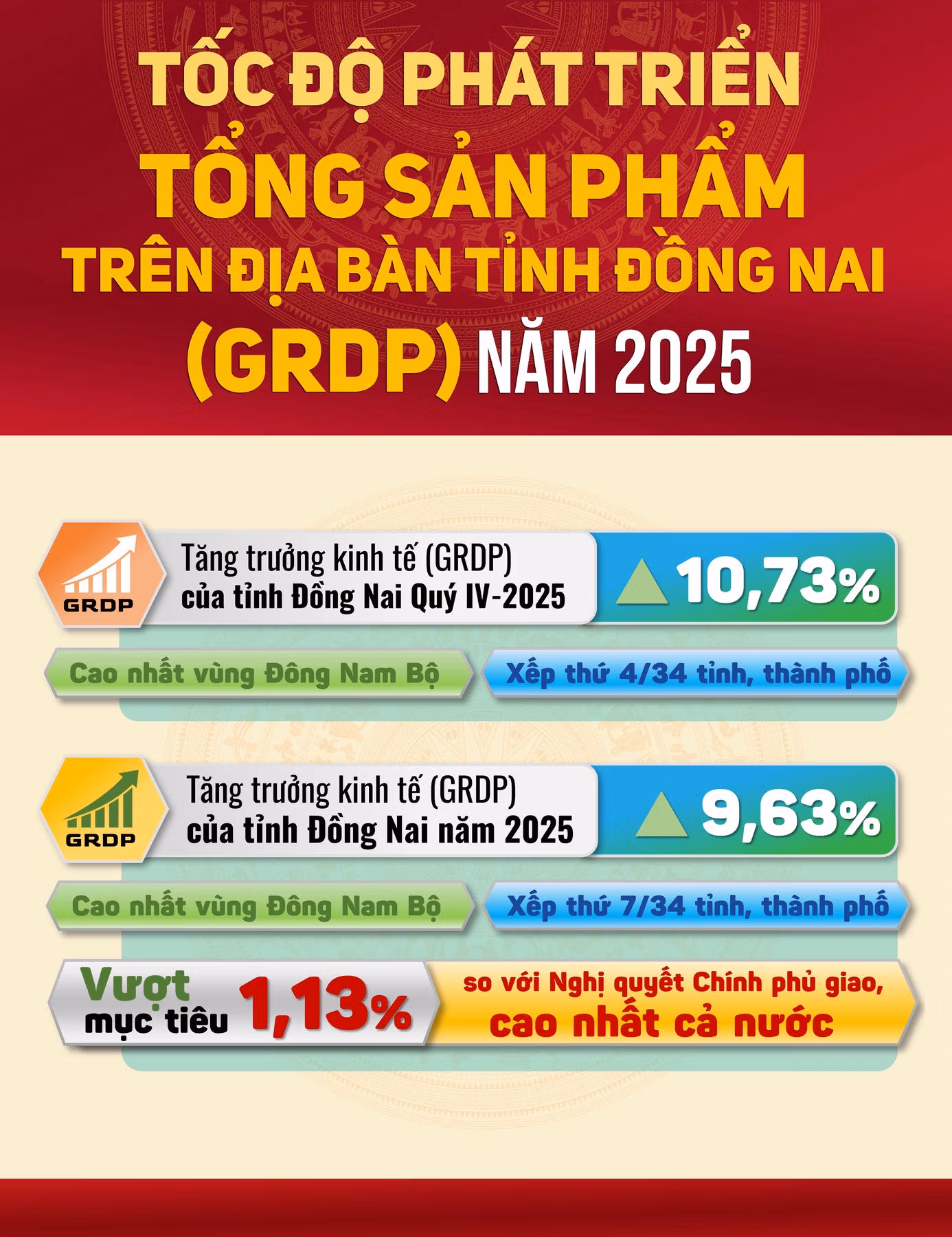 Đồng Nai xếp thứ 7 cả nước về tốc độ tăng GRDP và tiếp tục dẫn đầu vùng Đông Nam Bộ, khẳng định vai trò là một trong những cực tăng trưởng quan trọng của khu vực và cả nước.