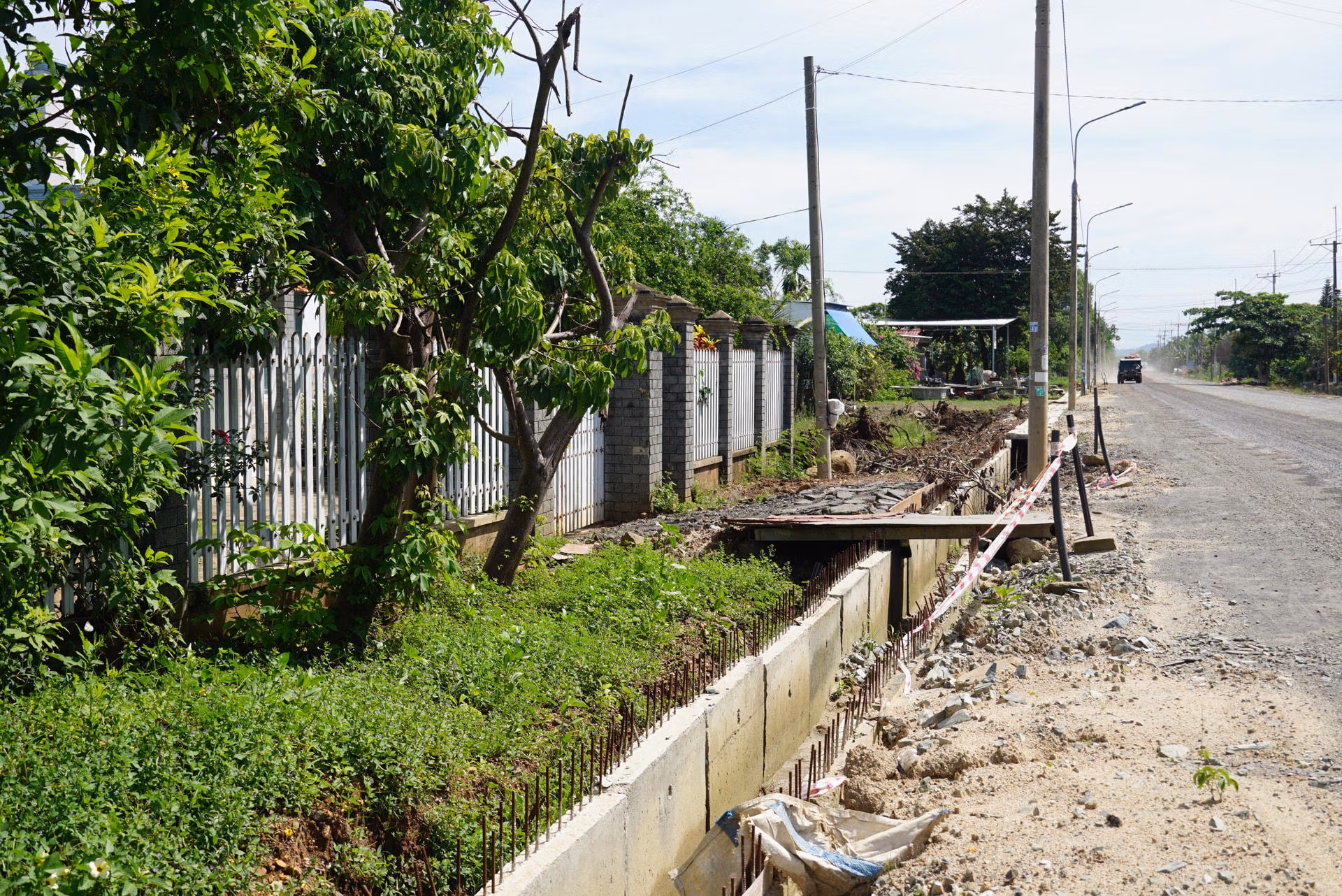 Song song với thi công đường là việc thi công hệ thống thoát nước. Theo ghi nhận, nhiều chỗ ống cống loại hộp vuông được chất đống hai bên đường với sắt thép lổm nhổm rất thiếu an toàn. Đặc biệt nghiêm trọng hơn cả là một số hộp ống cống đã được lắp đặt nhưng không có nắp đậy ngay trước nhiều nhà dân, nhiều đoạn đường ống cống lắp đặt cao hơn nền nhà dân nên việc đi lại khá khó khăn.