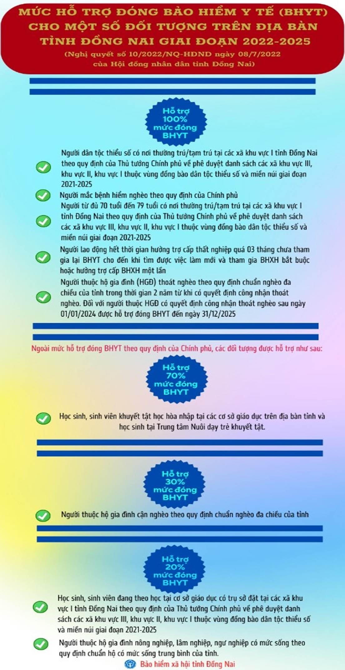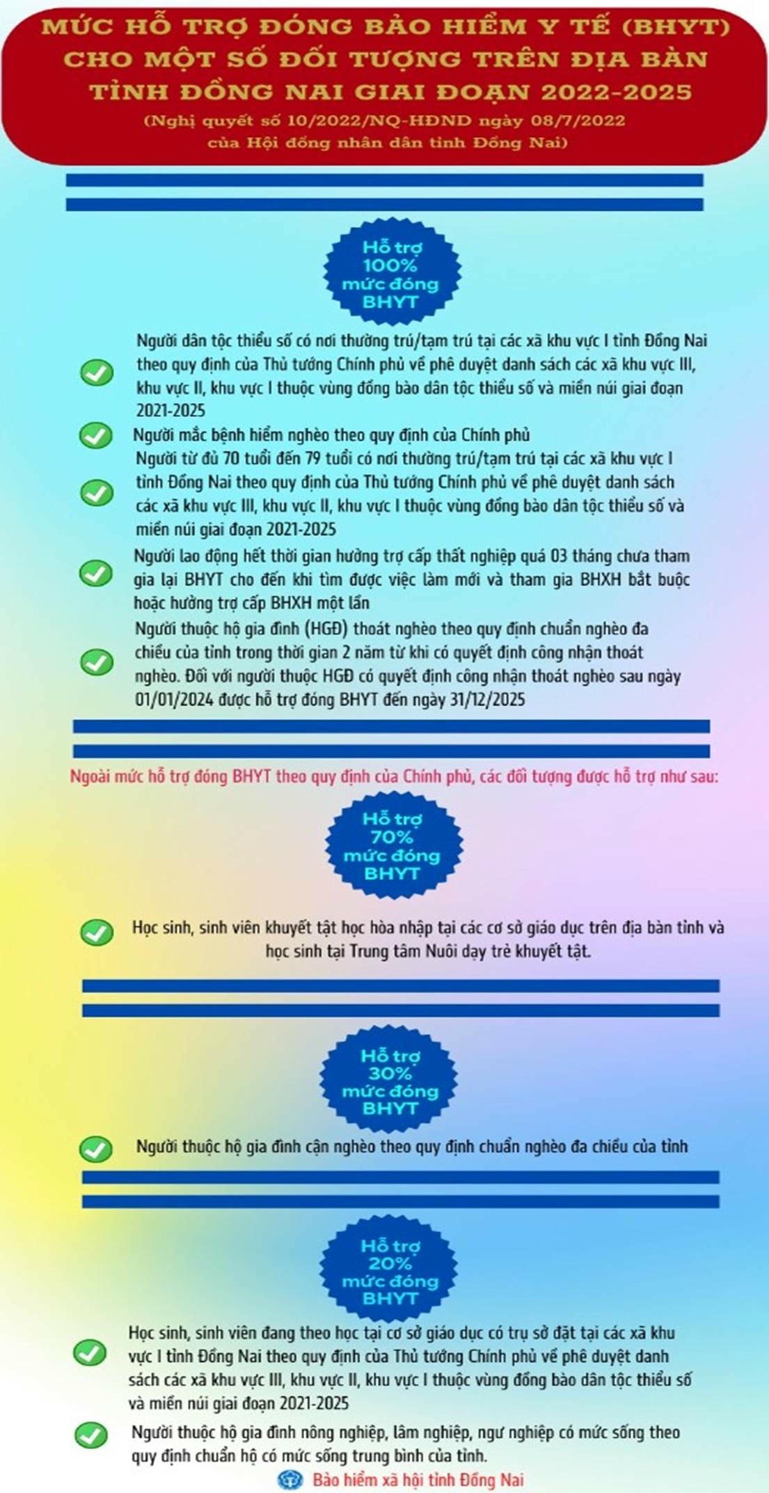 Trước đó, Hội đồng nhân dân tỉnh Đồng Nai đã ban hành Nghị quyết số 10/2022/NQ-HĐND ngày 08/7/2022 quy định mức hỗ trợ đóng BHYT cho một số đối tượng trên địa bàn tỉnh Đồng Nai giai đoạn 2022-2025. Mức hỗ trợ đóng cụ thể như sau: