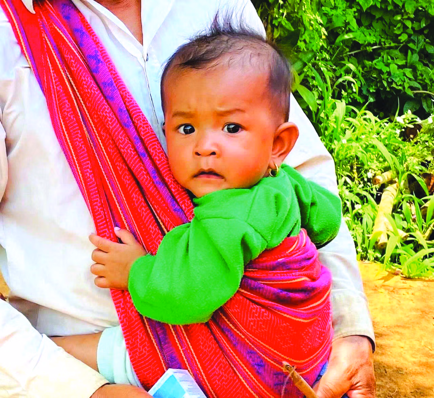 Con đường đất đỏ bị che khuất bởi màu xanh cây cỏ, thật khó để nhìn thấy lối rẽ từ đường lớn, dù tôi đã bật Google map. Vòng vèo một hồi, chúng tôi gặp người đàn ông Churu địu con đứng trước nhà, tôi vào hỏi thăm thì được ông tận tình hướng dẫn. Em bé phía sau thấy người lạ giương đôi mắt đen tròn nhìn chúng tôi với sự tò mò xen lẫn bẽn lẽn. Đôi mắt trong veo dễ thương ấy đã theo tôi suốt chặng đường sơn cước.
