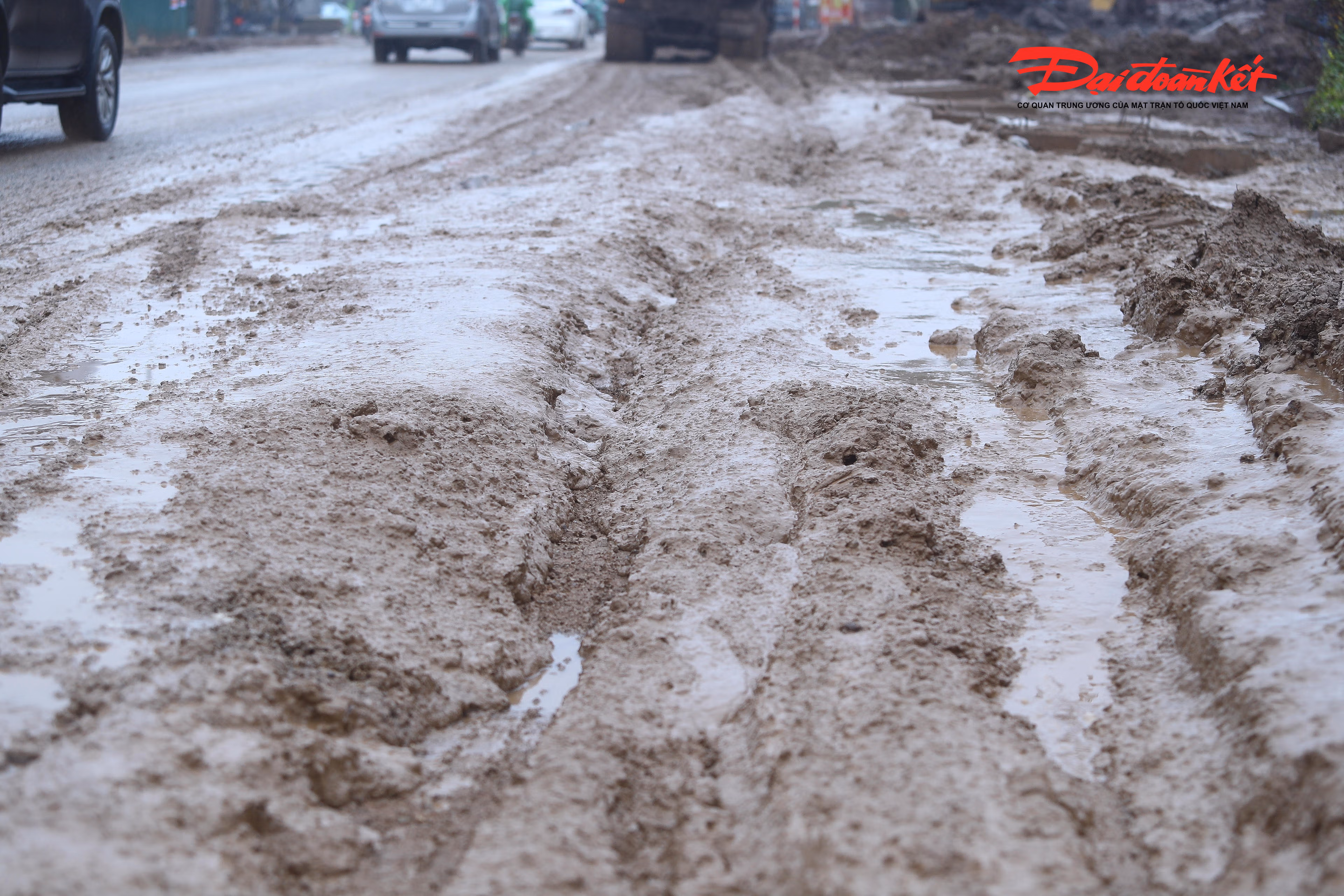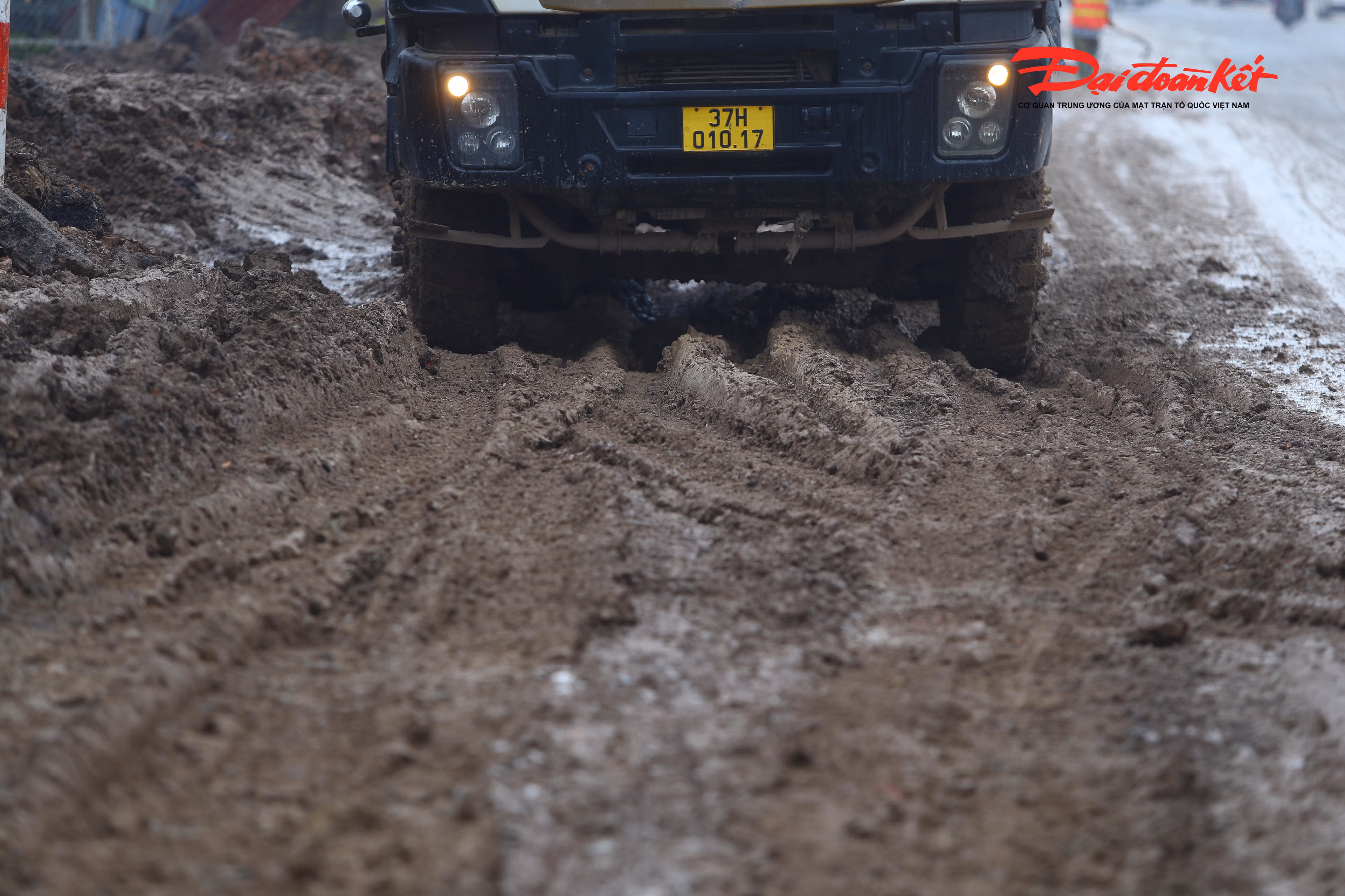 Hình ảnh lớp bùn đặc quánh tràn ra lòng đường.