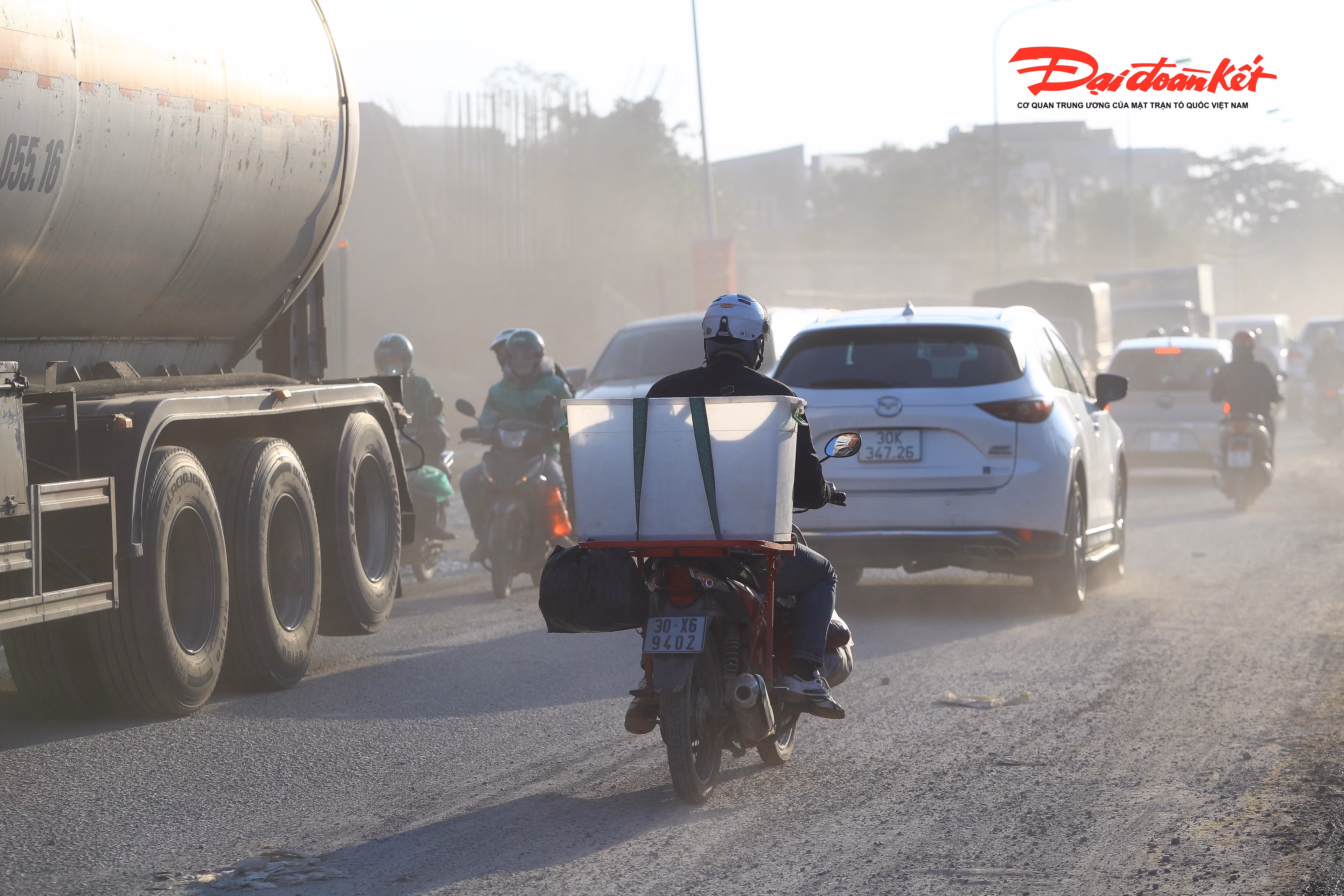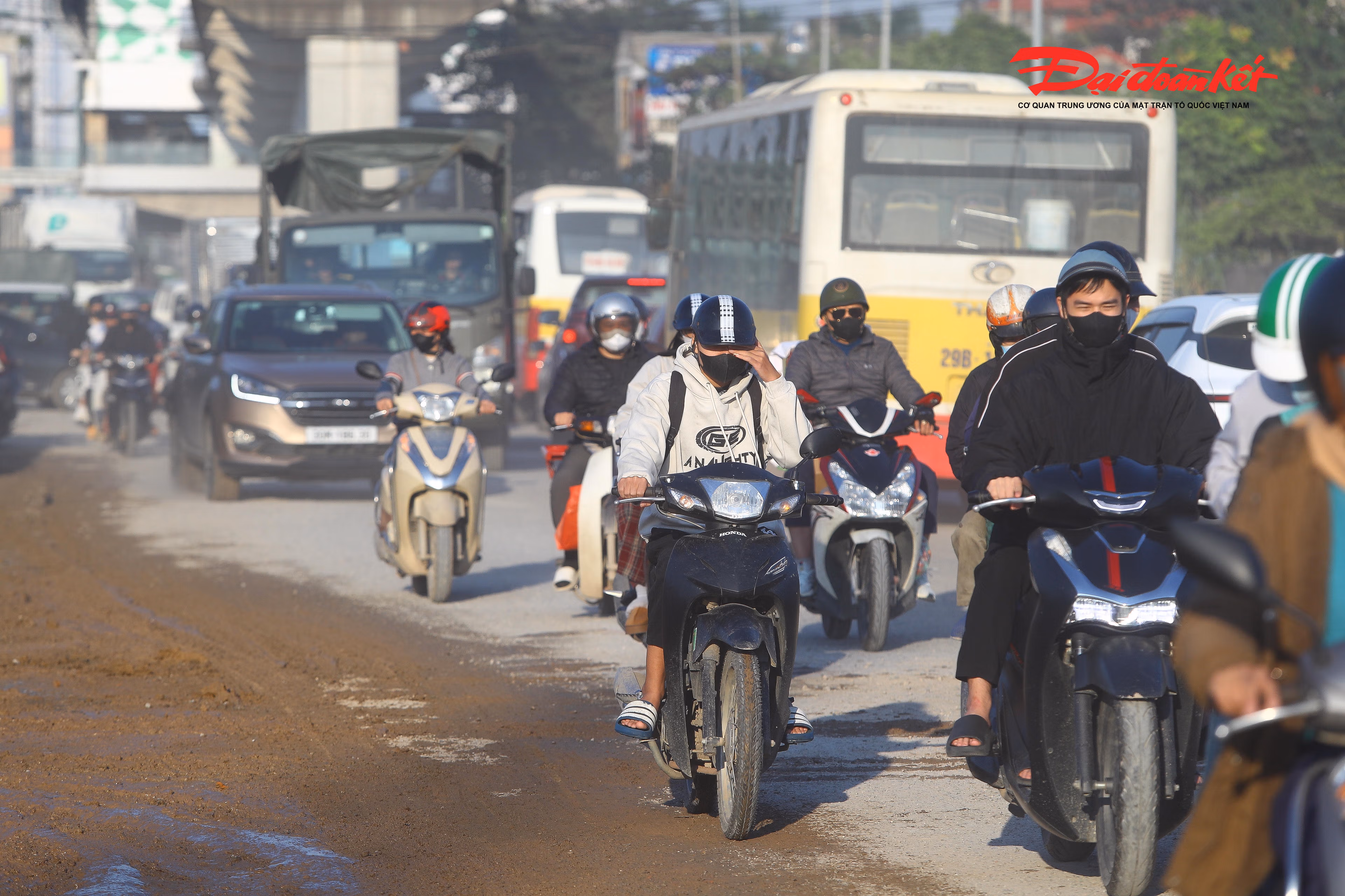 Hình ảnh xe tải cuốn đất đá, bùn khô dưới lòng đường thành bụi như sương mù. Đại diện Ban Quản lý dự án đầu tư xây dựng công trình giao thông thành phố Hà Nội cho biết, ngay sau khi nhận được phản ánh, đơn vị sẽ tiến hành xử lý ngay vấn đề trên.