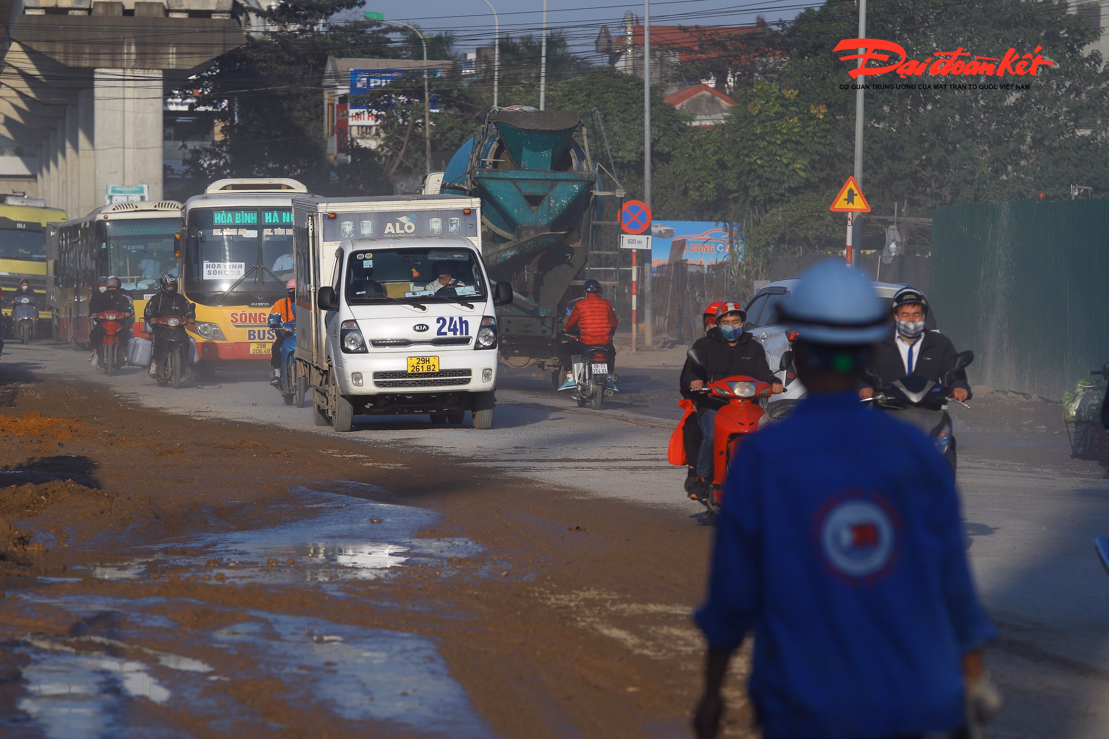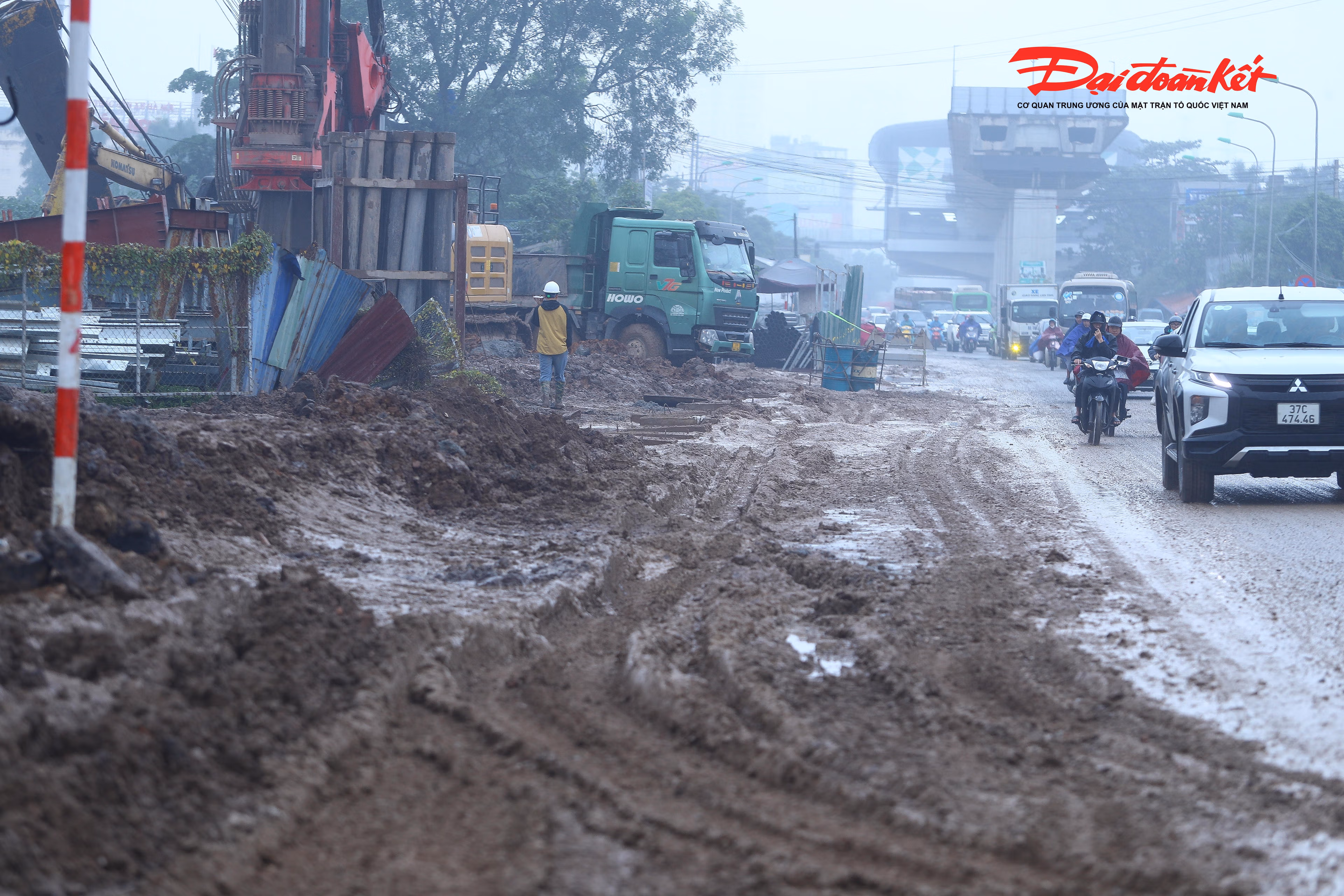 Việc thi công hạng mục cầu vượt nút giao Quốc lộ 6 qua vành đai 4 (phường Yên Nghĩa, Hà Nội) bùn tràn ra đường, ngày nắng thì bụi bẩn, ngày mưa thì lầy lội khiến việc di chuyển của người dân gặp nhiều khó khăn.