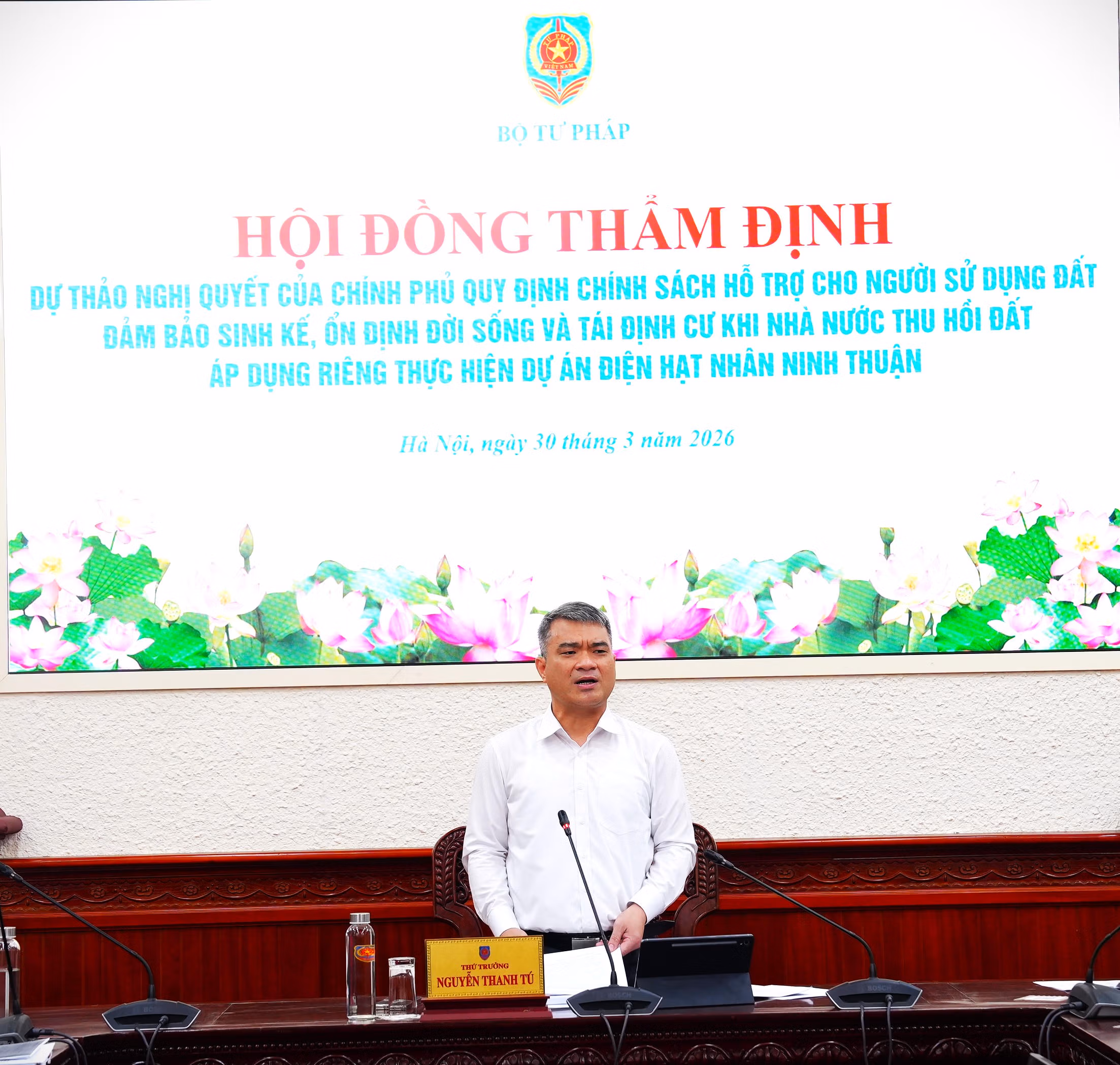 Chiều 30/3, tại Bộ Tư pháp diễn ra cuộc họp Hội đồng thẩm định dự thảo Nghị quyết của Chính phủ quy định chính sách hỗ trợ cho người sử dụng đất, đảm bảo sinh kế, ổn định đời sống và tái định cư khi Nhà nước thu hồi đất áp dụng riêng thực hiện Dự án điện hạt nhân Ninh Thuận.