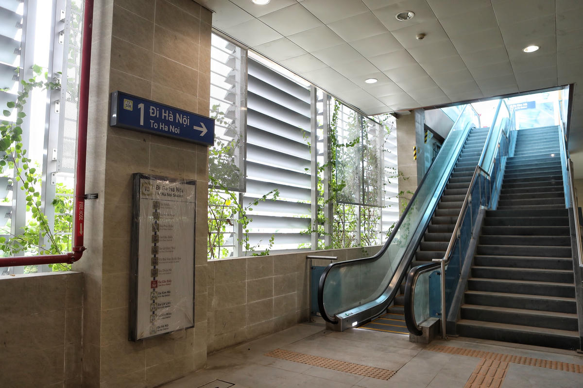 Mặt bên của công trình nhà ga có sự kết hợp hài hoà giữa thảm cây xanh, hệ lam hắt chống nắng bằng vật liệu nhôm đúc nguyên khối và các tấm kim loại không gỉ đã được gia công tạo hình đảm bảo sự thông thoáng cho khu vực công cộng của nhà ga. Đây là loại vật liệu tương đối cao cấp, hình thức, mẫu mã phong phú, đa dạng, với những đặc điểm bền, đẹp, không bám bụi bẩn, dễ bảo dưỡng và thay thế. Hệ bao che bằng tấm kim loại không gỉ có đục lỗ tạo nên sự thoáng đãng, điều hòa không khí và thân thiện với môi trường, thích ứng điều kiện khí hậu nhiệt đới của Hà Nội.