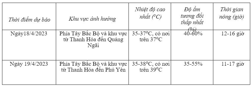 Từ ngày 18 đến 23/4, ở miền Bắc và miền Trung có khả năng xảy ra nắng nóng diện rộng, với nền nhiệt độ cao nhất phổ biến 35-38 độ C, có nơi trên 39 độ C.