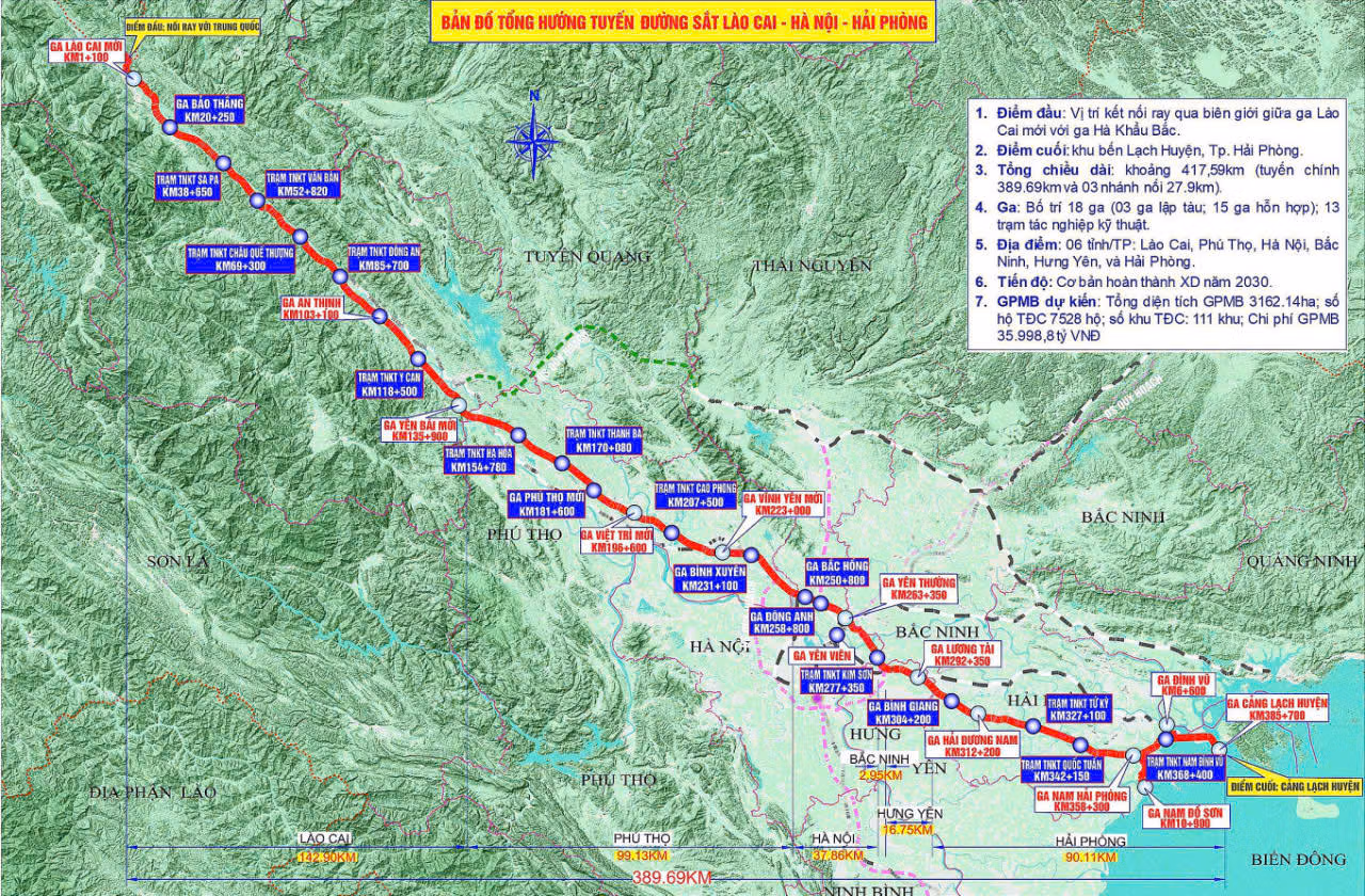 Theo đó, Dự án đầu tư xây dựng tuyến đường sắt Lào Cai - Hà Nội - Hải Phòng được Quốc hội Quyết định chủ trương đầu tư dự án tại Nghị quyết số 187/2025/NQ-QH ngày 19/2/2025 với Tổng mức đầu tư sơ bộ là 203.231 tỷ đồng. Dự án đi qua 6 tỉnh, thành phố gồm: Lào Cai, Phú Thọ, Hà Nội, Bắc Ninh, Hưng Yên, Hải Phòng.