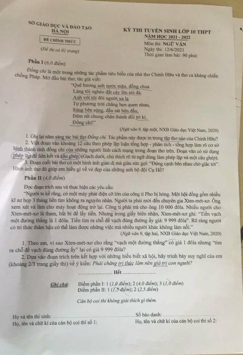 Phần I (6,0 điểm): Trích đoạn bài thơ “Đồng chí” quen thuộc, là một trong những văn bản quan trọng của chương trình, càng quan trọng hơn ở tính thời sự khi tình đồng chí cần được mở rộng quan niệm, phát huy giá trị trong những ngày cả nước đang đương đầu cùng “giặc” Covid-19.