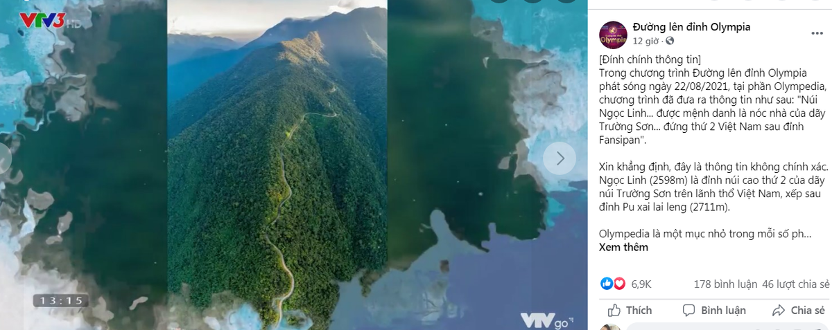 "Trong chương trình Đường lên đỉnh Olympia phát sóng ngày 22/08/2021, tại phần Olympedia, chương trình đã đưa ra thông tin như sau: "Núi Ngọc Linh được mệnh danh là nóc nhà của dãy Trường Sơn... đứng thứ 2 Việt Nam sau đỉnh Fansipan".