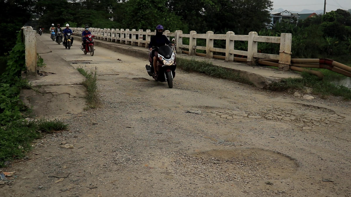 Vào thời điểm tan tầm buổi sáng từ 10 - 11h30 hay buổi chiều từ 16h - 17h30, cây cầu lại ùn tắc cục bộ khi đủ các loại xe chen lấn, cố đi qua cây cầu với vô vàn ổ voi, ổ gà rải khắp mặt cầu.