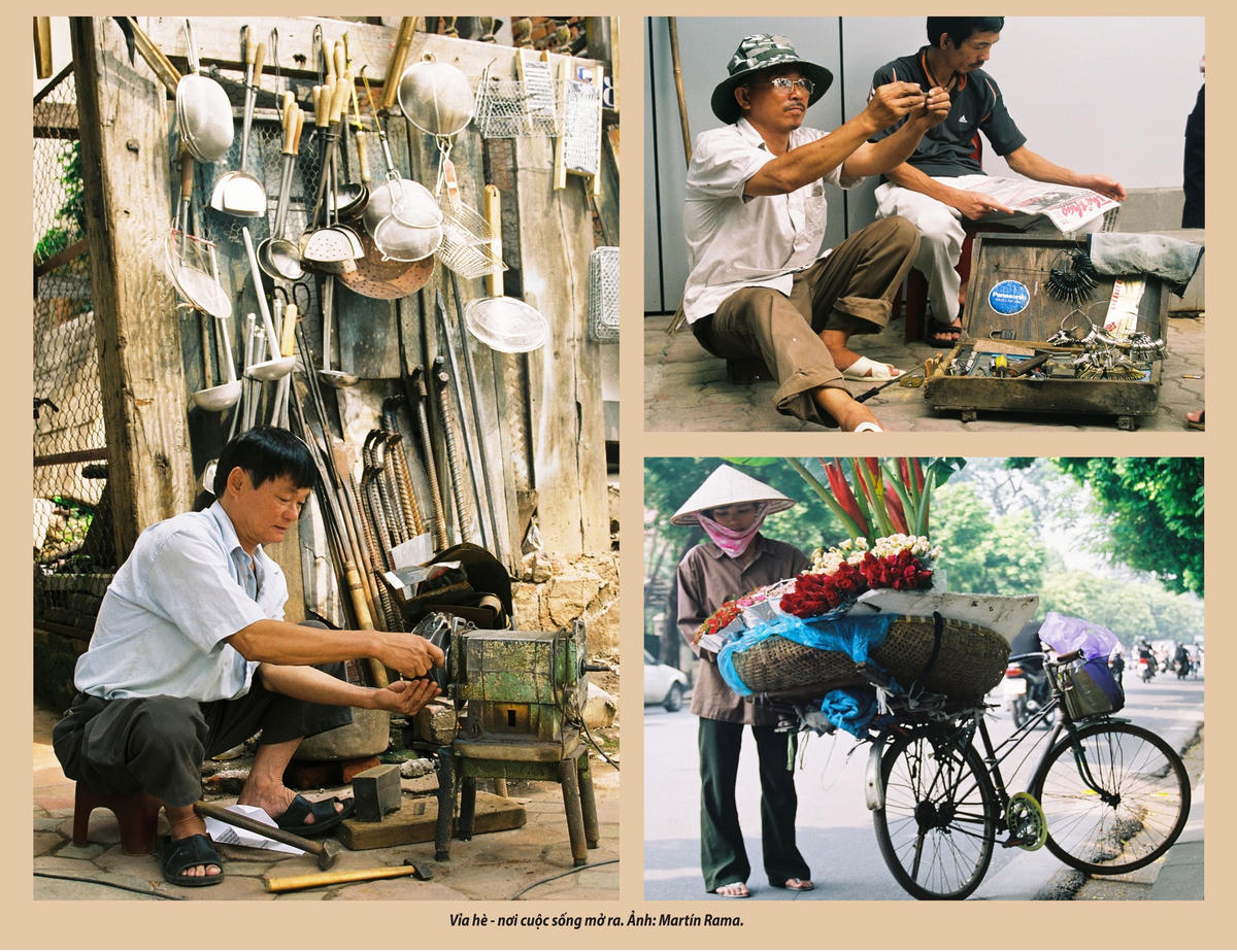 - Trong nhiều năm sống ở Hà Nội, tôi chưa bao giờ cảm thấy mệt mỏi khi đi dạo xung quanh, tận hưởng sức sống đường phố và ghi lại những nét văn hóa của thành phố ở mọi ngã rẽ. Mặc cho sự phát triển của nền kinh tế, nhiều hoạt động buôn bán hồi đó vẫn diễn ra trên đường phố. Từ rổ rá đến than củi, từ hoa quả đến đồ gốm sứ, từ giày dép đến chăn chiếu... Gần như tất cả mọi thứ đều có thể được vận chuyển trên những chiếc xe thồ, xe đạp hay xe máy và rao bán dọc đường. Vỉa hè Hà Nội là những khu chợ nhộn nhịp, là nơi thuận tiện để người ta mua mớ rau, cắt tóc hay sắm một chậu cây cảnh. Và chúng vẫn như vậy cho đến ngày nay.