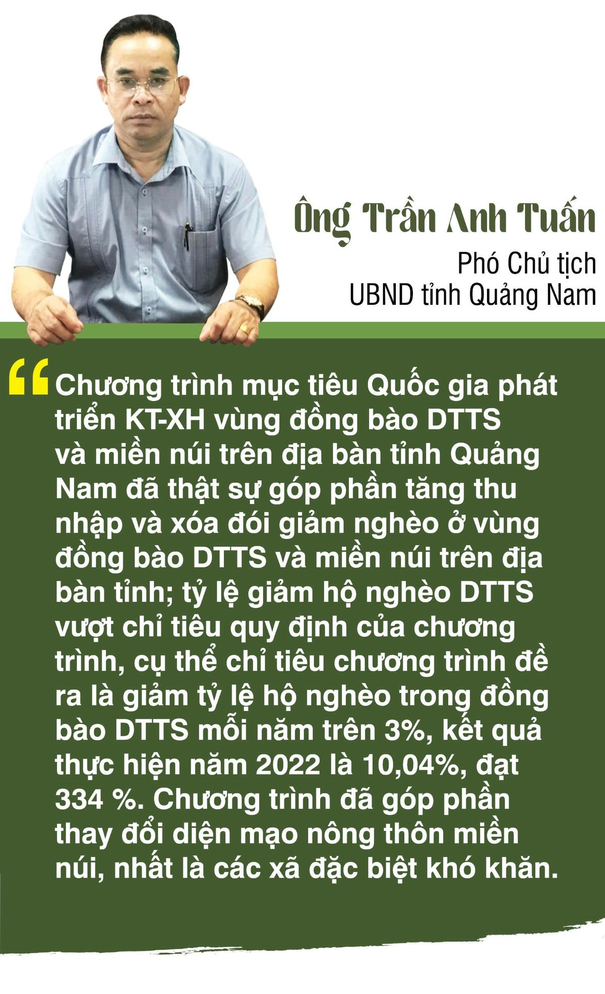 Theo đó, để triển khai hiệu quả Quyết định số 1719/QĐ-TTg của Thủ tướng Chính phủ về việc phê duyệt Chương trình mục tiêu quốc gia phát triển kinh tế - xã hội (KT-XH) vùng đồng bào dân tộc thiểu số (DTTS) và miền núi giai đoạn 2021 - 2030, giai đoạn I: từ năm 2021 đến năm 2025 cùng với đó là Nghị quyết số 12-NQ/TU ngày 20/7/2021 của Tỉnh ủy về phát triển KT-XH vùng đồng bào DTTS và miền núi của Tỉnh ủy Quảng Nam, tại tỉnh Quảng Nam đã cụ thể hóa và triển khai thực hiện đồng bộ, kịp thời các nội dung nói trên cùng với những chính sách quan trọng khác.