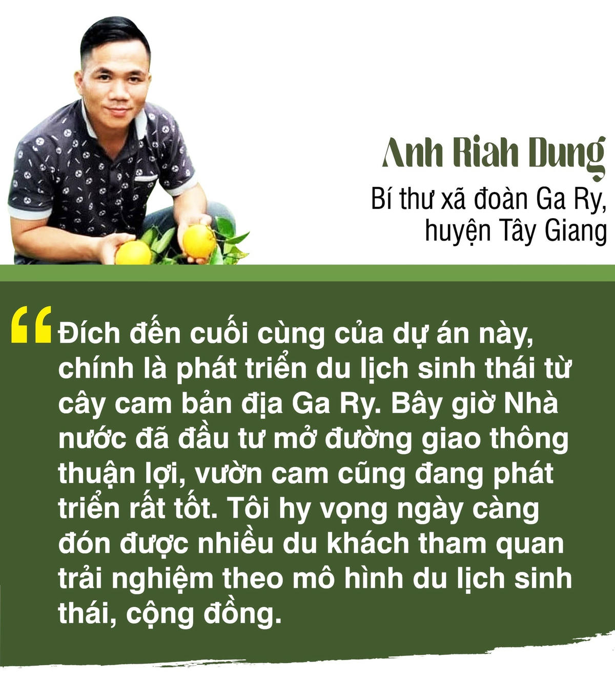 Điển hình như anh Riah Dung, bí thư xã đoàn Ga Ry, huyện Tây Giang, anh đã nhận thấy ở địa phương có tiềm năng phát triển du lịch từ kinh tế, mô hình trang trại vườn nên đã quyết tâm khởi nghiệp với sản phẩm trồng cây cam đặc trưng của vùng cao xứ Quảng. Năm 2020 anh Dung đã trồng gần 10 ha trồng cam và kết hợp với chăn nuôi chuồng trại, bước đầu đem lại hiệu quả. Mô hình của anh Dung nằm trong dự án “Du lịch sinh thái gắn kết cam bản địa Tây Giang” được UBND tỉnh Quảng Nam công nhận là ý tưởng khởi nghiệp sáng tạo cấp tỉnh năm 2019.