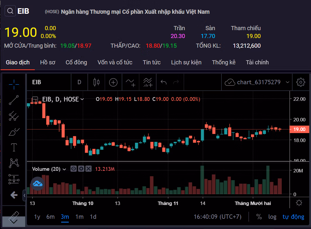 Trên sàn chứng khoán, kết thúc phiên giao dịch ngày 12/12, giá cổ phiếu EIB dừng lại ở mức 19.000 đồng/cổ phiếu, giảm 12% trong vòng 3 tháng trở lại đây và thấp hơn giá bán mục tiêu hơn 1.000 đồng/cổ phiếu.