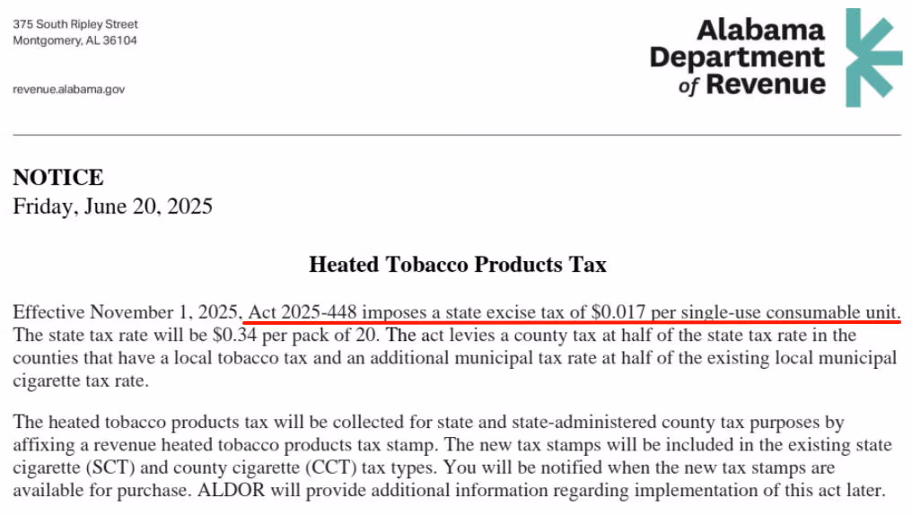 Tại bang Alabama, dù vẫn khẳng định TLNN không hoàn toàn vô hại, Thống đốc đã ký ban hành đạo luật giảm thuế TLNN xuống còn 1,7 cent mỗi điếu với kỳ vọng rằng chính sách này sẽ giúp giảm phơi nhiễm độc chất so với việc tiếp tục hút thuốc lá truyền thống.