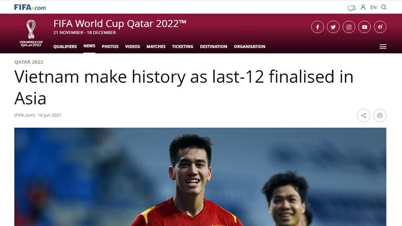 "Bước vào giai đoạn cuối của vòng loại thứ hai với tư cách đội đầu bảng, đội tuyển Việt Nam giành chiến thắng liên tiếp trước Indonesia và Malaysia để vươn lên trở thành một trong những đội nhì bảng xuất sắc nhất và chỉ suýt thua đội chủ nhà UAE với tỷ số 2-3 ở trận đấu cuối cùng", trang chủ FIFA viết.
