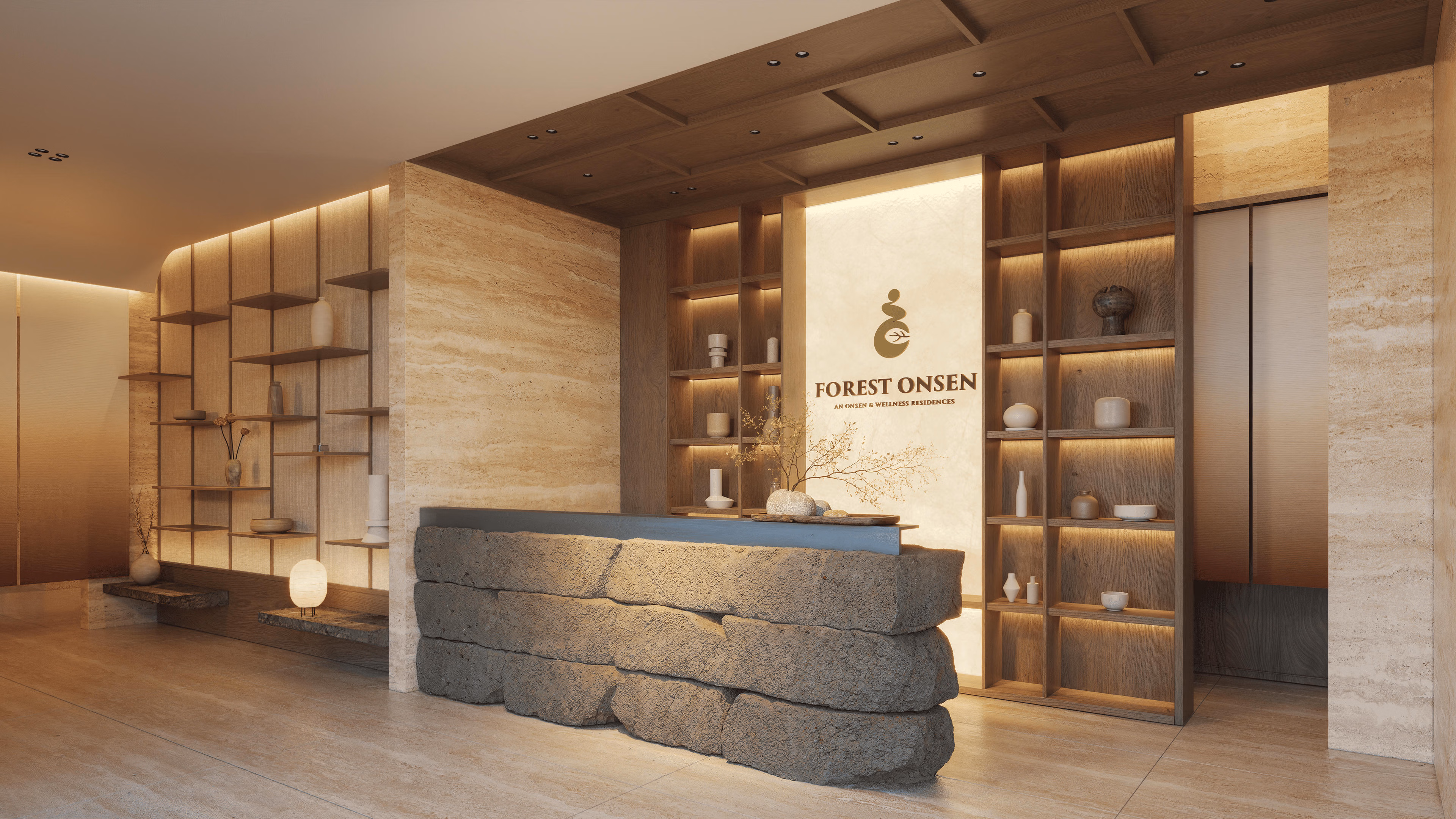 Forest Onsen được thiết kế với cảnh quan mang âm hưởng nghỉ ngơi, phục hồi và trị liệu. Ngay từ bước chân đầu tiên khi bước vào khu vực cảnh quan nội khu, người dùng đã được đưa về trạng thái nghỉ ngơi khi mắt được tiếp xúc với màu xanh của các tầng tán thực vật, các họa tiết và tiểu cảnh đậm chất Nhật như vườn sỏi, đường dạo thiền, khu dừng nghỉ tích hợp âm thanh trong trẻo của nước, gió dịu nhẹ len lỏi trong nội khu.