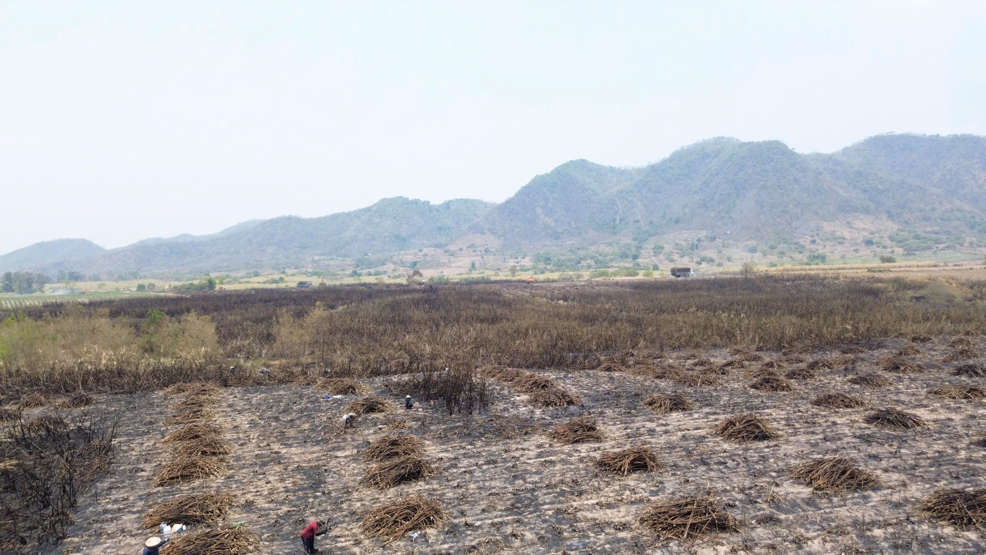 Ghi nhận tại hiện trường, chúng tôi nhìn thấy nhiều cánh đồng mía bị cháy phủ màu đen xám, vẫn còn ám khói. Hàng chục người dân cùng nhân công các nhà máy đường được huy động khẩn trương thu hoạch, bó mía và vận chuyển đi tiêu thụ.