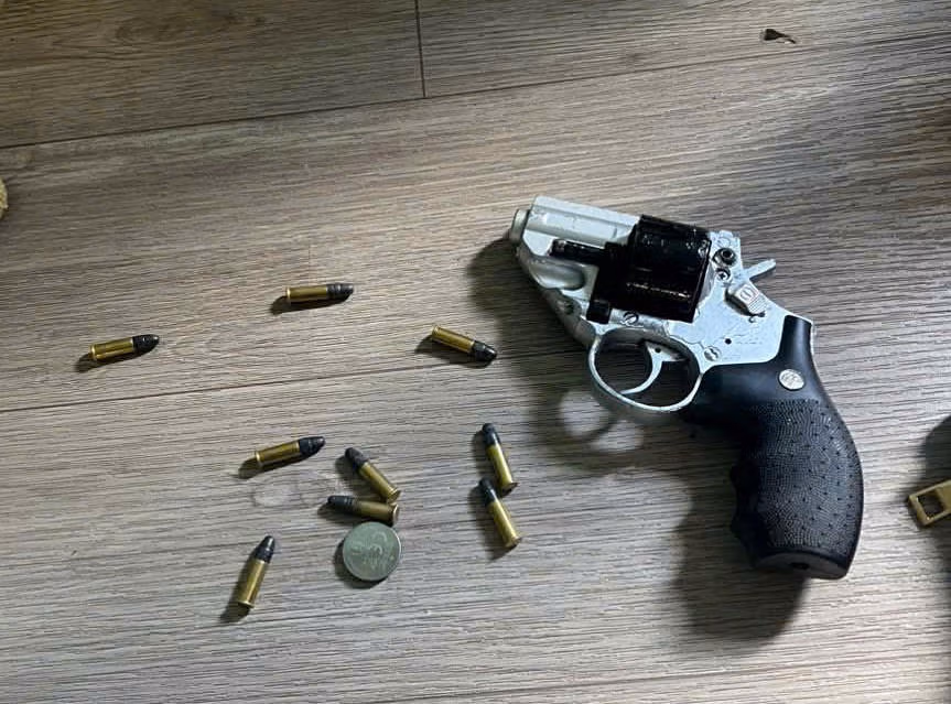 Quá trình khám xét, công an còn thu giữ một khẩu súng ngắn dạng trục xoay, bên trong có 6 viên đạn, cùng 3 viên đạn khác để bên ngoài.