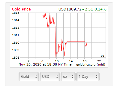 Sau vài ngày lao dốc mạnh, ngày 26/11, giá vàng thế giới trụ lại gần ở ngưỡng 1.800 USD/ounce do đồng đô la Mỹ. suy yếu trở lại. Tuy nhiên, giá vàng thế giới vẫn chịu sức ép do hàng loạt tin tức lạc quan về vaccine phòng COVID-19 khiến giá vàng neo ở mức thấp. Giá vàng chịu thêm áp lực khi các quỹ đầu tư đẩy mạnh bán ra và tại châu Á chưa vào mùa cao điểm.
