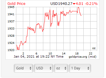 Sáng 5/1, lúc 7h30 (theo giờ Việt Nam), giá vàng thế giới ở mức 1.941 USD/ounce. Giá vàng trên thị trường quốc tế tăng vọt trong bối cảnh đồng USD suy yếu và số ca nhiễm Covid-19 lan nhanh. Hiện giá vàng đang ở mức cao nhất trong 2 tháng qua.