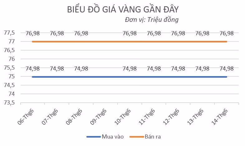 Tính đến 8h40 ngày 14/6, giá vàng miếng được SJC niêm yết ở mức 74,98 - 76,98 triệu đồng/lượng mua vào - bán ra, giữ nguyên giá so với chốt phiên hôm trước.