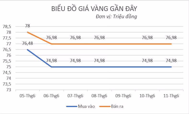 Tính đến 8h40 ngày 11/6, giá vàng miếng được SJC niêm yết ở mức 74,98 - 76,98 triệu đồng/lượng mua vào - bán ra, giữ nguyên giá so với chốt phiên hôm trước.