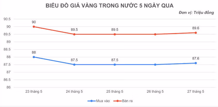 Tính đến 8h30 ngày 27/5, giá vàng SJC niêm yết ở mức 87,6 triệu đồng/lượng mua vào và 89,6 triệu đồng/lượng bán ra. So với chốt phiên tuần qua, giá vàng SJC tăng nhẹ 100.000 đồng/lượng ở cả 2 chiều.