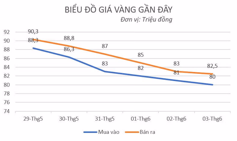Tính đến 8h35 ngày 3/6, giá vàng miếng được SJC niêm yết ở mức 80 - 82,5 triệu đồng/lượng mua vào - bán ra, giảm 2 triệu đồng/lượng ở chiều mua và 500.000 đồng/lượng ở chiều bán so với chốt phiên hôm trước.