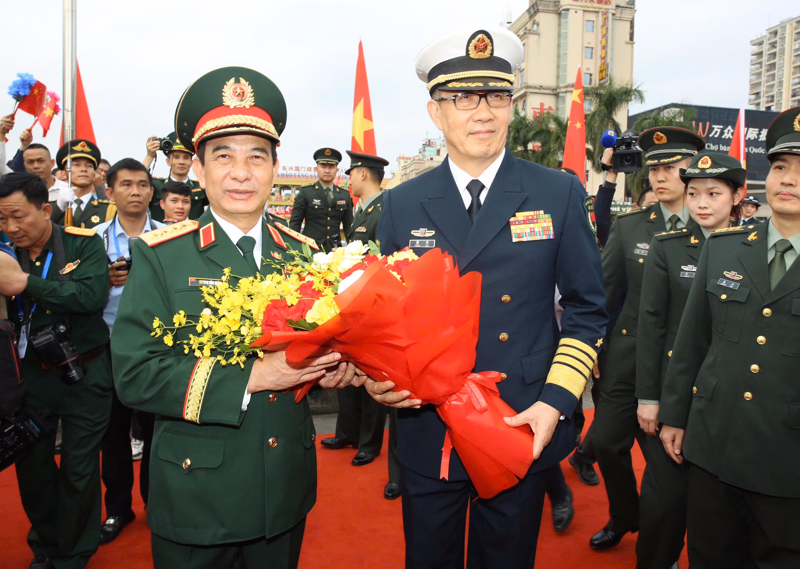 Đại tướng Phan Văn Giang nồng nhiệt chào đón Thượng tướng Đổng Quân cùng đoàn đại biểu Trung Quốc sang Việt Nam tham dự giao lưu.