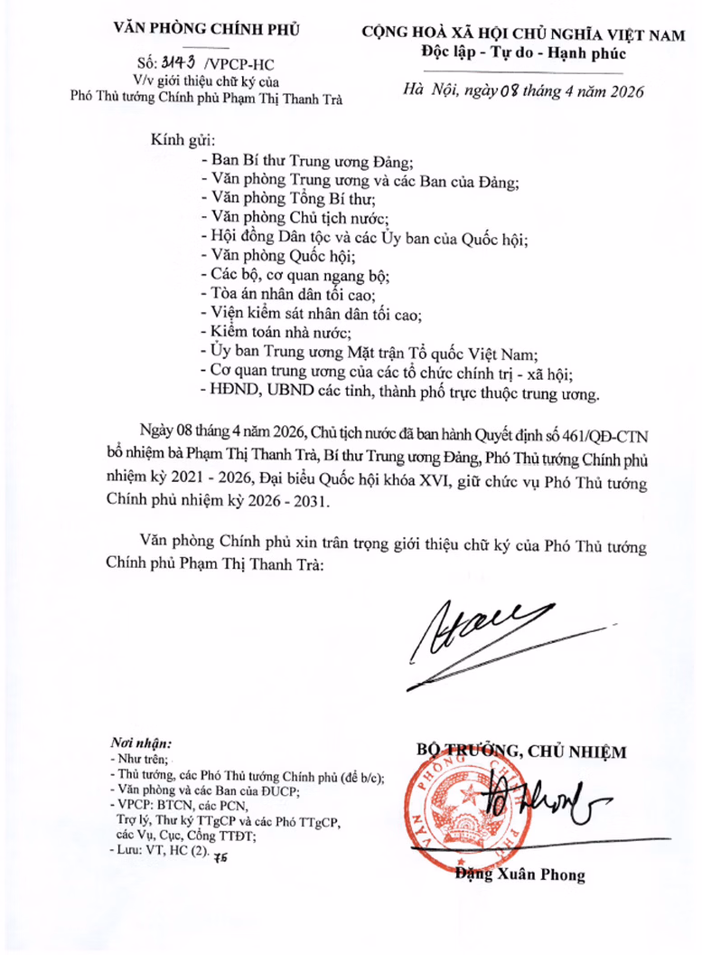 Văn bản giới thiệu chữ ký của Phó Thủ tướng Chính phủ Phạm Thị Thanh Trà: