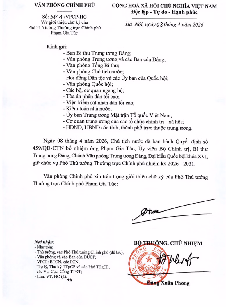 Ngày 8/4/2026, Chủ tịch nước đã ban hành Quyết định số 459/QĐ-CTN bổ nhiệm ông Phạm Gia Túc, Ủy viên Bộ Chính trị, Bí thư Trung ương Đảng, Chánh Văn phòng Trung ương Đảng, Đại biểu Quốc hội khóa XVI, giữ chức vụ Phó Thủ tướng Thường trực Chính phủ nhiệm kỳ 2026-2031.