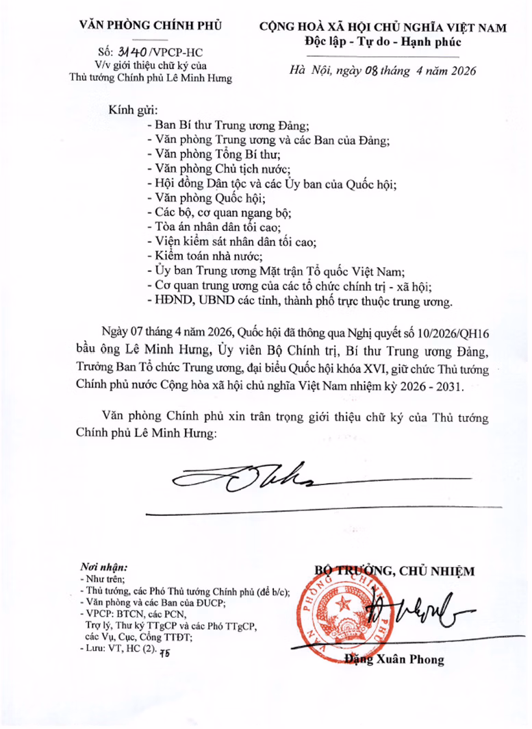 Văn phòng Chính phủ vừa có các văn bản giới thiệu chữ ký của Thủ tướng Chính phủ Lê Minh Hưng; Phó Thủ tướng Thường trực Chính phủ Phạm Gia Túc và các Phó Thủ tướng Chính phủ: Phan Văn Giang, Phạm Thị Thanh Trà, Hồ Quốc Dũng, Nguyễn Văn Thắng, Lê Tiến Châu.
