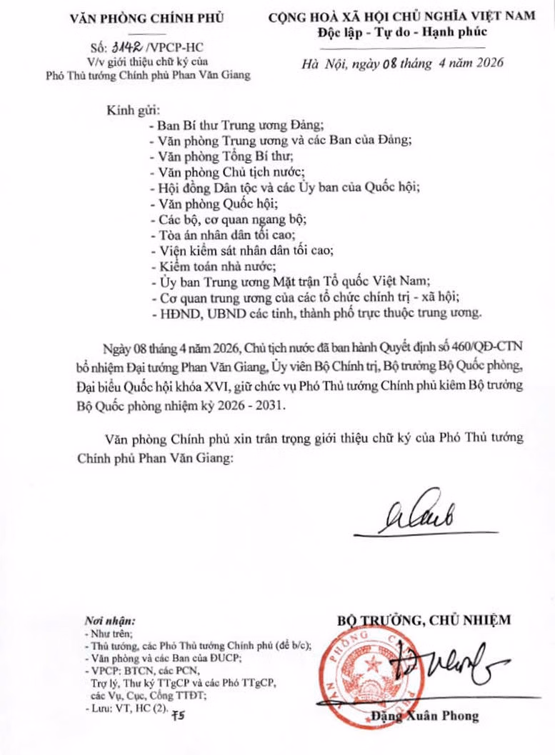 Ngày 8/4/2026, Chủ tịch nước đã ban hành Quyết định số 460/QĐ-CTN bổ nhiệm Đại tướng Phan Văn Giang, Ủy viên Bộ Chính trị, Bộ trưởng Bộ Quốc phòng, Đại biểu Quốc hội khóa XVI, giữ chức vụ Phó Thủ tướng Chính phủ kiêm Bộ trưởng Bộ Quốc phòng nhiệm kỳ 2026-2031.