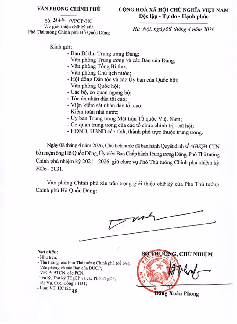 Ngày 8/4/2026, Chủ tịch nước đã ban hành Quyết định số 463/QĐ-CTN bổ nhiệm ông Hồ Quốc Dũng, Ủy viên Ban Chấp hành Trung ương Đảng, Phó Thủ tướng Chính phủ nhiệm kỳ 2021-2026, giữ chức vụ Phó Thủ tướng Chính phủ nhiệm kỳ 2026-2031.