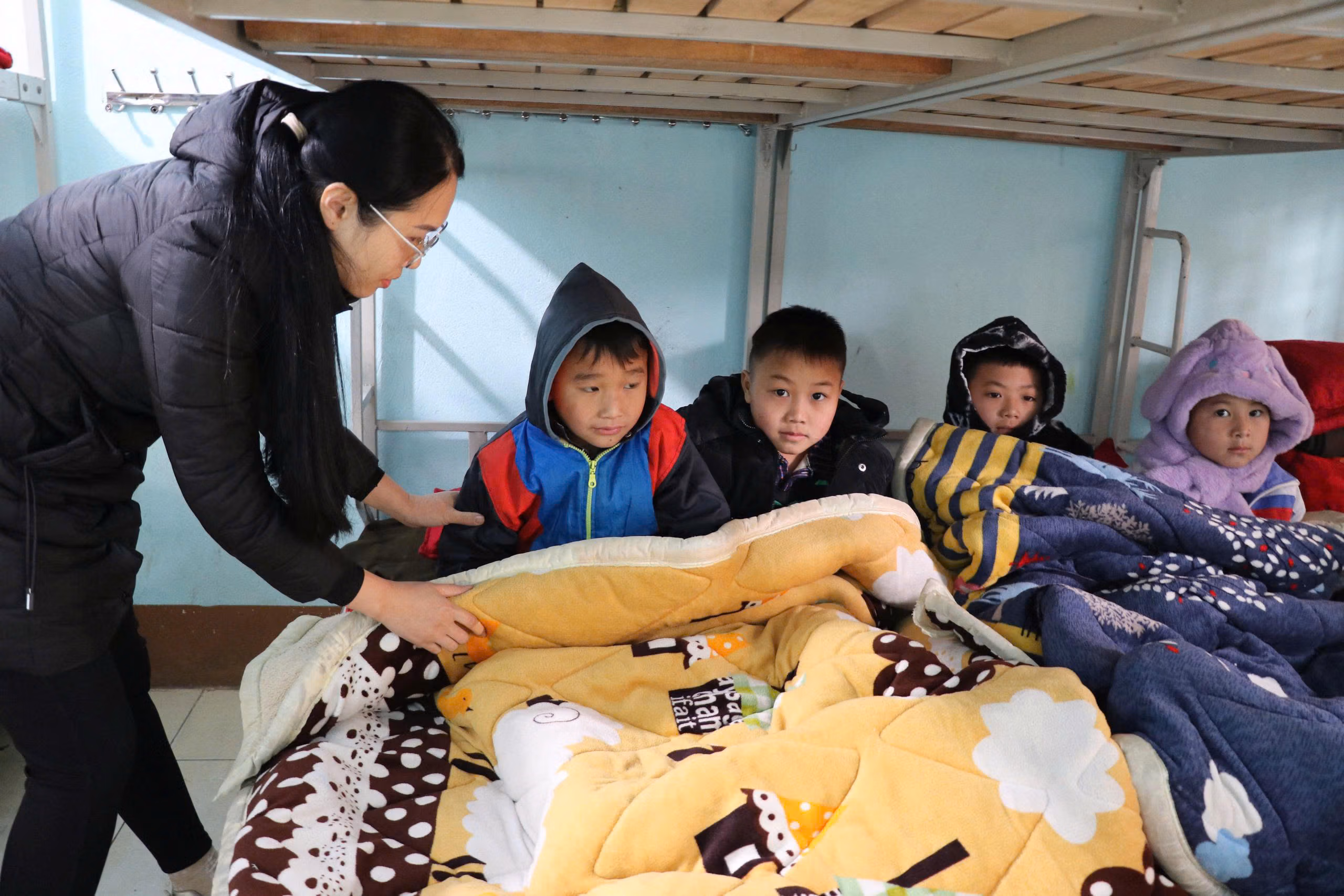 Từ khu bán trú đến lớp học, các phòng ở đều được che chắn kín gió, chăn đệm được bổ sung, phơi sấy khô thường xuyên. Giáo viên trực bán trú kiểm tra giấc ngủ, sinh hoạt của học sinh hằng ngày, nhắc nhở các em giữ ấm trong điều kiện nhiệt độ xuống thấp.