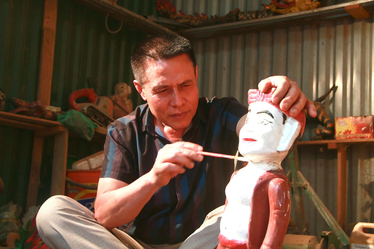 Trong căn nhà xưởng với những mảnh gỗ, lọ sơn nhiều màu sắc, anh Phi tỉ mỉ họa lên những nhân vật rối nước. Tạo hình nhân vật rối nước không chỉ cần sự khéo léo, mà cái chính là sự đam mê cháy bỏng với nghề.