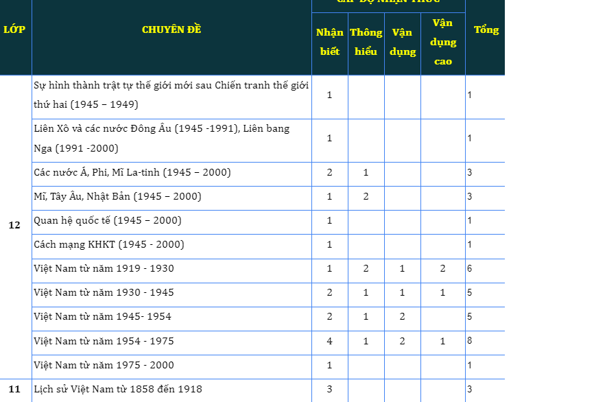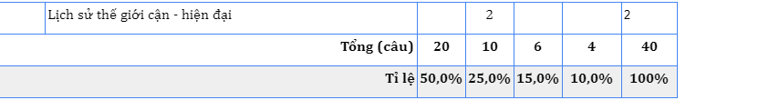 Ma trận đề thi Lịch sử cụ thể như sau: