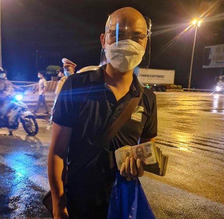 19h tối ngày 29/7, nghe tin có đoàn 600 người hồi hương về quê, anh Doãn Thiên Tú (36 tuổi, TP Vinh, Nghệ An) cùng với 4 người trong nhóm tức tốc chạy ra chốt kiểm dịch trên cầu Bến Thủy giúp đỡ, hỗ trợ người dân từ miền Nam trở về.