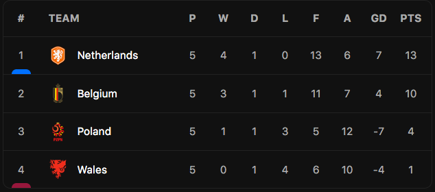 Ở trận đấu cùng giờ, Bỉ hạ Wales 2-1, Hà Lan tiếp tục đứng đầu bảng A4 nhưng chưa thể chính thức giành vé đi tiếp do mới hơn đội nhì bảng Bỉ 3 điểm. Hà Lan và Bỉ sẽ có trận quyết đấu trực tiếp vào ngày 26/9 tới.