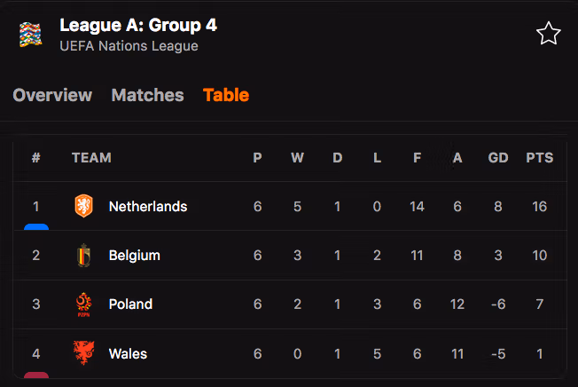 "Cơn lốc màu da cam" sở hữu 16 điểm, hơn Bỉ 6 điểm. Hà Lan là đội duy nhất tại League A không thua trận nào và giành tấm vé thứ hai sau Croatia vào vòng bán kết UEFA Nations League.