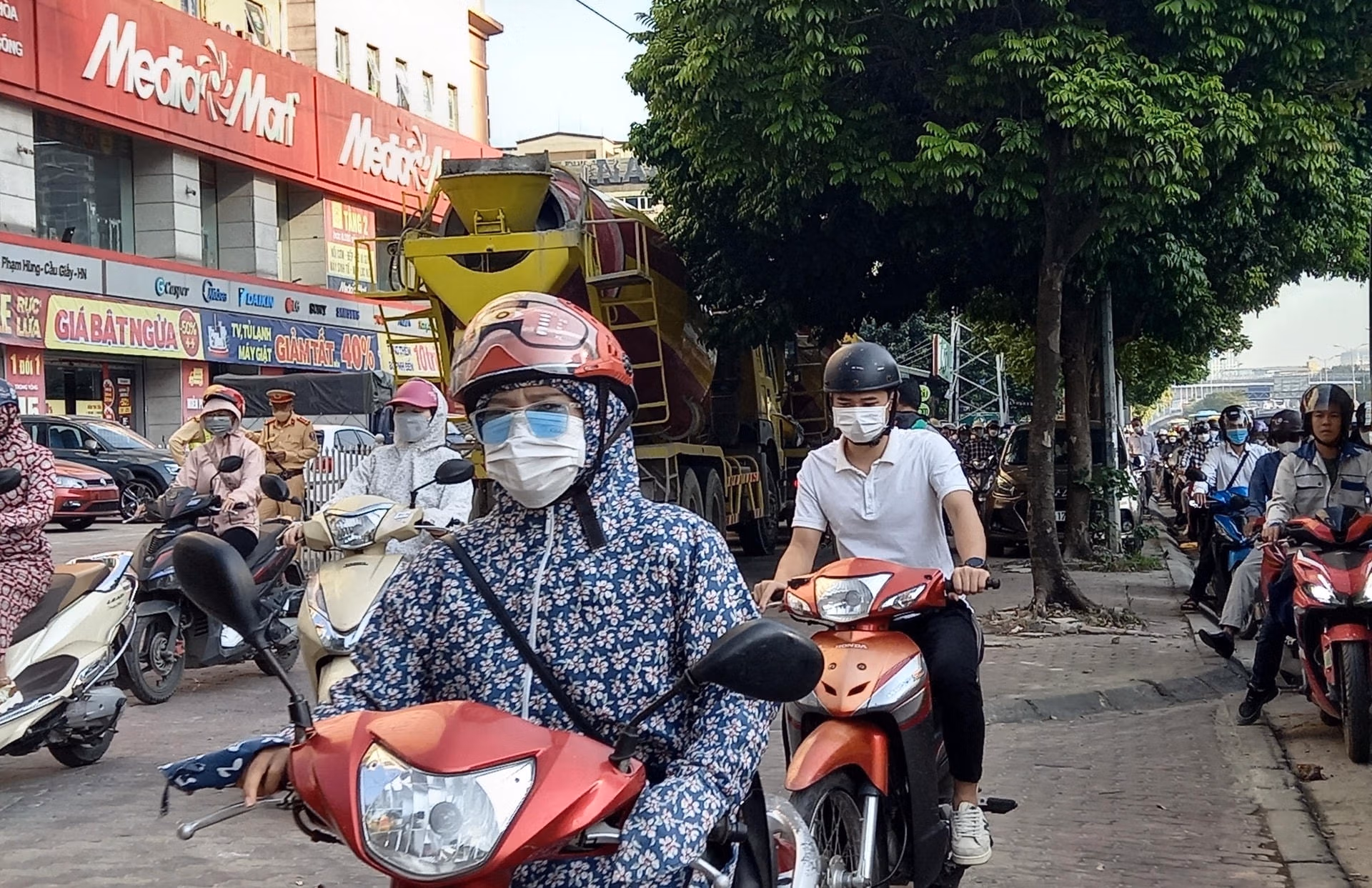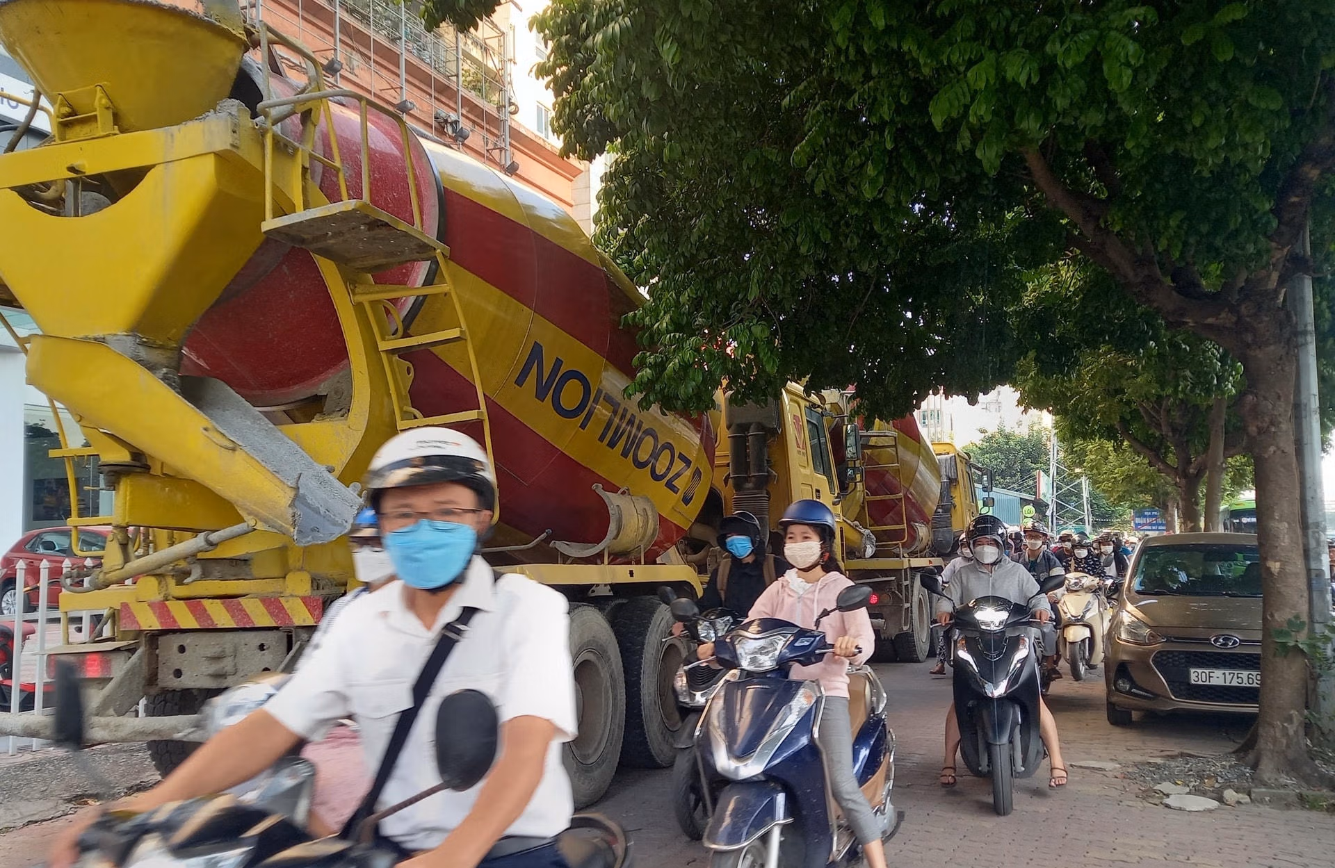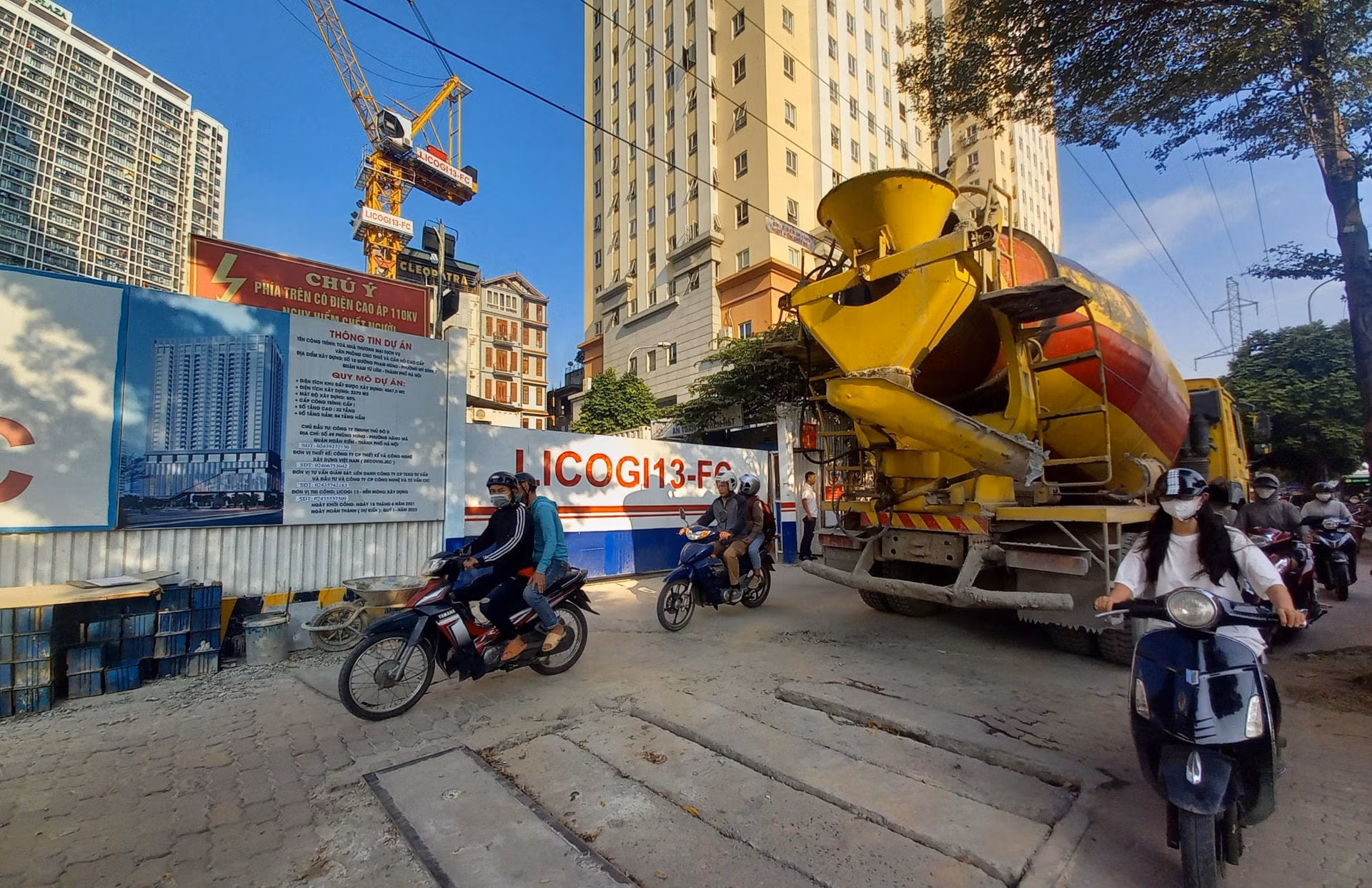 Trong đó, bên trong dự án có 2 xe bồn đang tích cực cung cấp bê tông tươi để đổ cột móng trụ, 3 xe bồn bê tông đỗ chềnh ềnh bên ngoài đường Phạm Hùng gây mất an ninh trật tự, an toàn giao thông. Do những xe bồn bê tông cỡ lớn đỗ chềnh ềnh trên vỉa hè vào giờ cao điểm (từ 6h - 9h sáng) làm cho giao thông hỗn loạn, người đi bộ không có lối đi, xe máy chen chúc leo lên vỉa hè khá vất vả.
