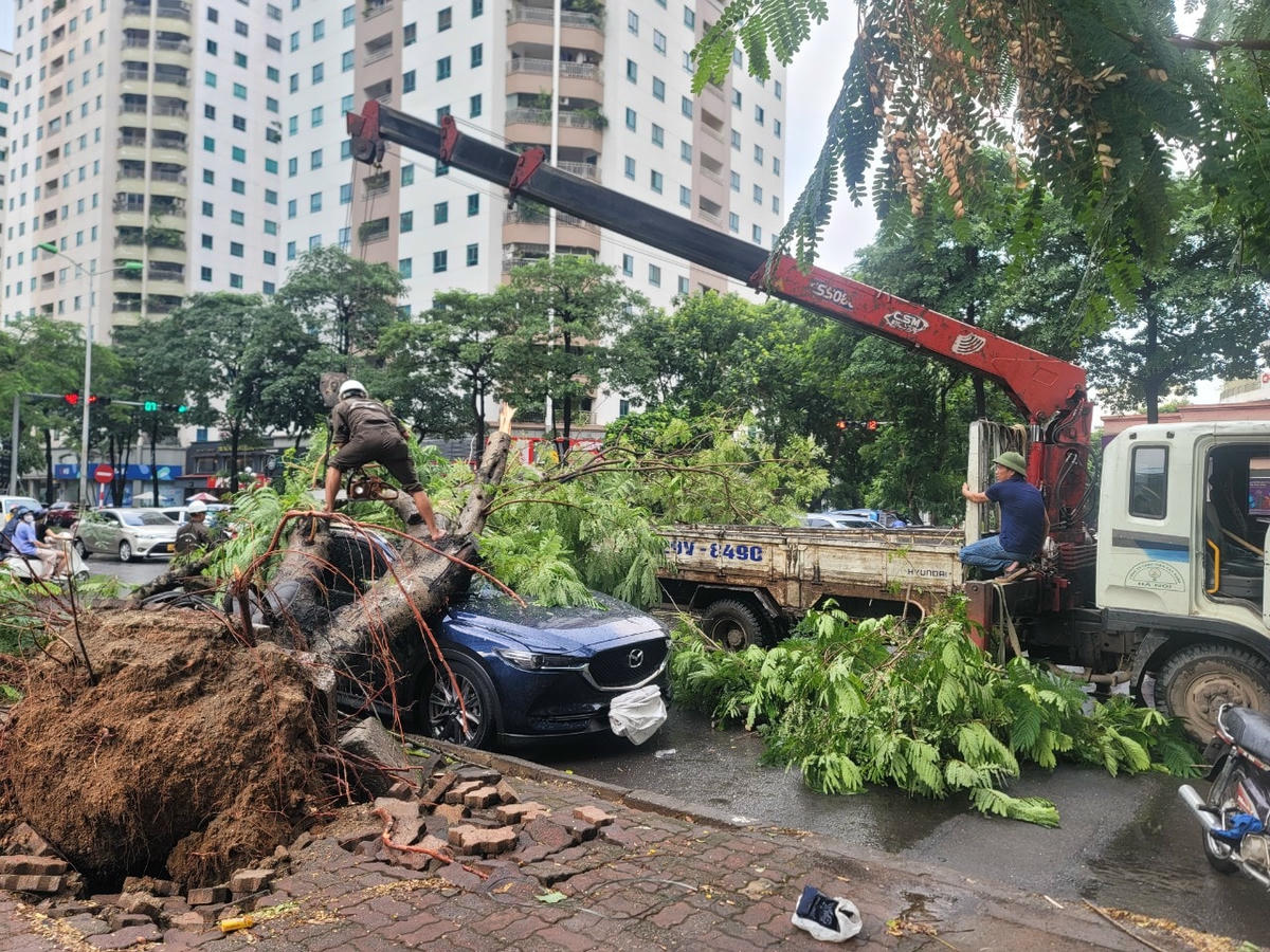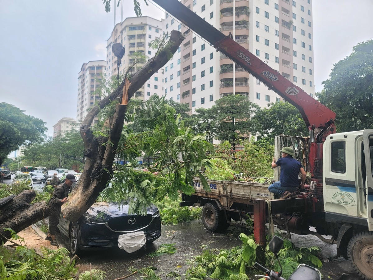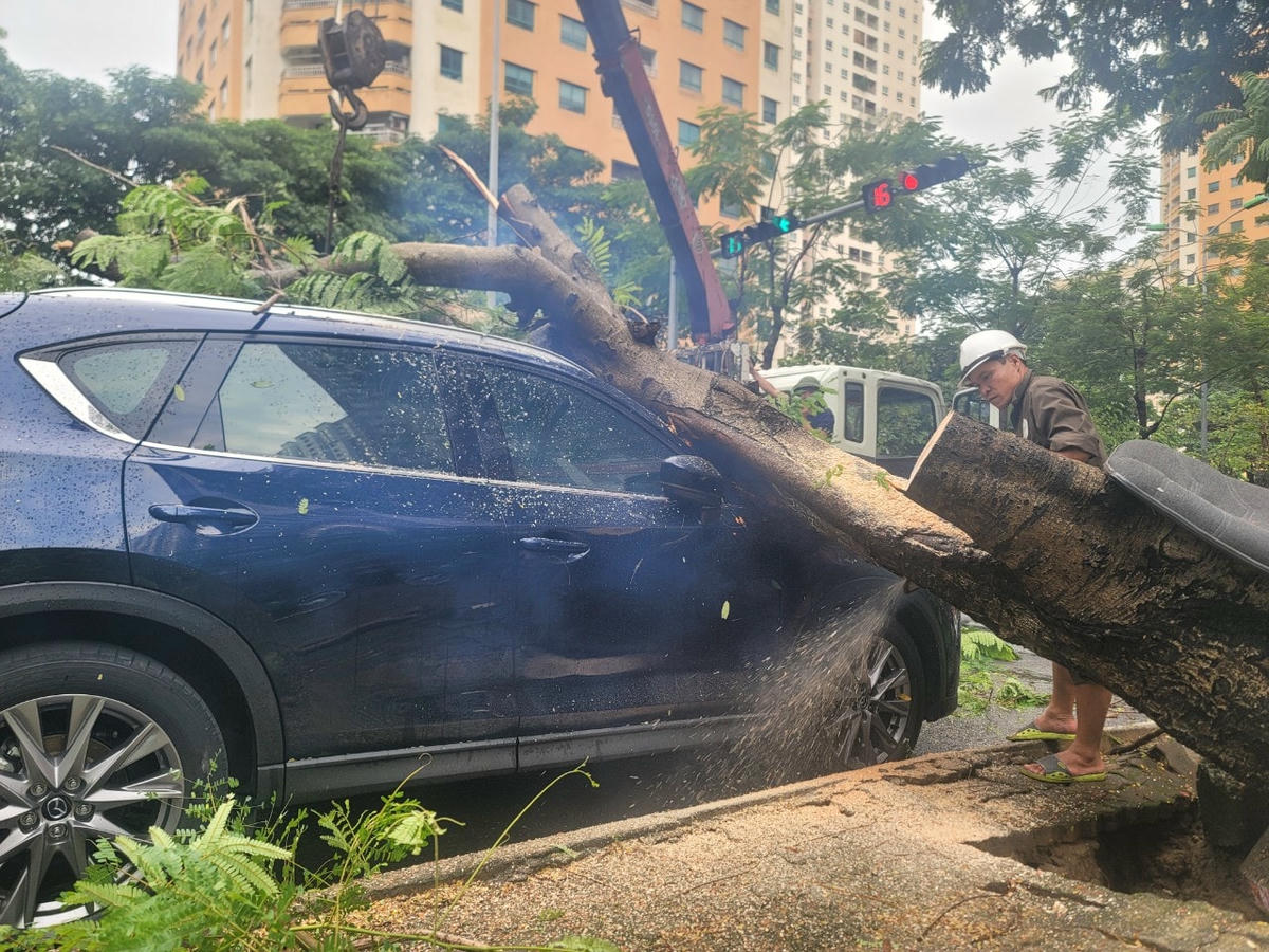 Gió lớn khiến cây phượng lớn bật gốc ngã đè lên phần kính lái chiếc xe.Vụ việc xảy ra ngay tại ngã tư đường Hoàng Đạo Thúy - Hoàng Ngân (phường Trung Hòa, quận Cầu Giấy). Cây đổ ngã chắn hết phần đường...Nhận được tin phản ánh của quần chúng, Công ty Công viên Cây xanh Hà Nội đã ngay lập tức điều người và công cụ tới hiện trường.Nhân viên Công ty Công viên Cây xanh Hà Nội khẩn trương cưa cắt.Một số công nhân thu dọn cành cây trên lòng đường.Anh Thành, 34 tuổi, nhân viên Công ty Công viên Cây xanh Hà Nội cho biết, hiện chủ xe chưa xuất hiện tại hiện trường. Nhận được tin báo, anh cùng các nhân viên khác đã nhanh chóng đến hiện trường thu dọn để đảm bảo an toàn giao thông.Thân cây sau khi cắt đã được chuyển đi.Chiếc xe bị hư hỏng phần kính lái và trần xe.Sự việc thu hút sự theo dõi của nhiều cư dân sống gần đó và người đi đường.