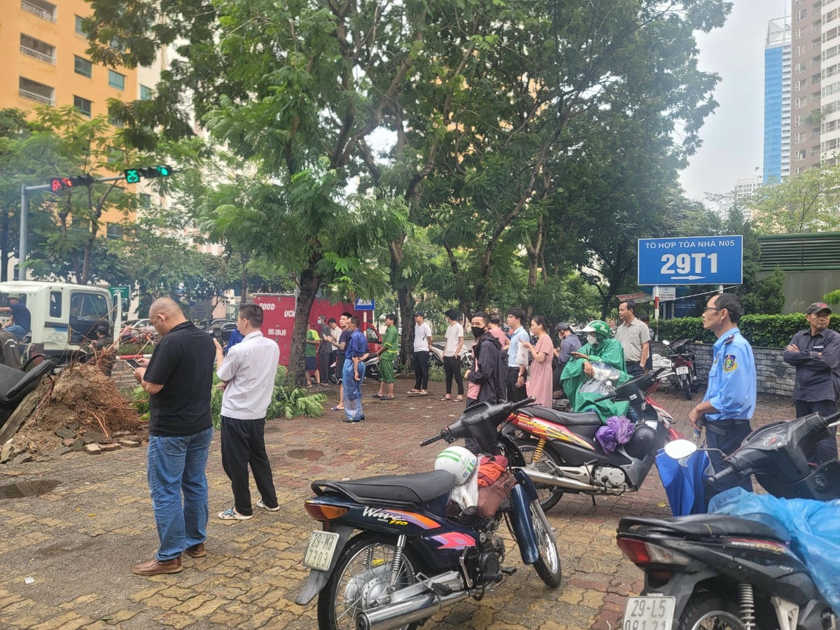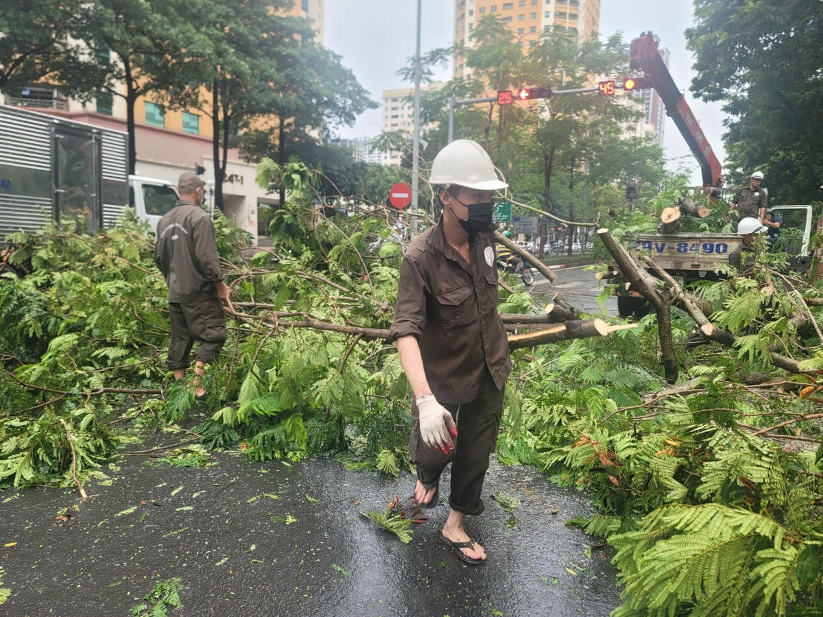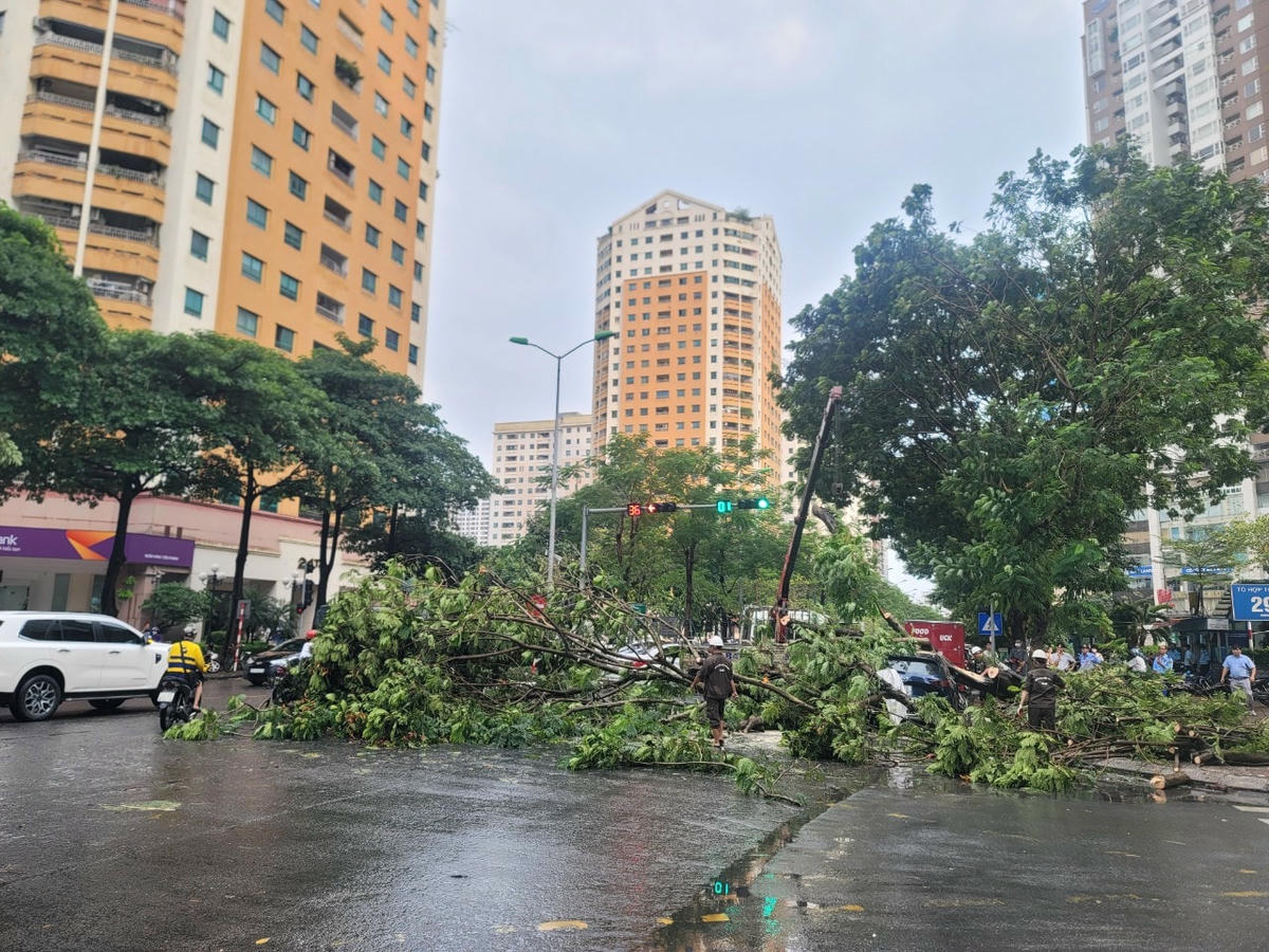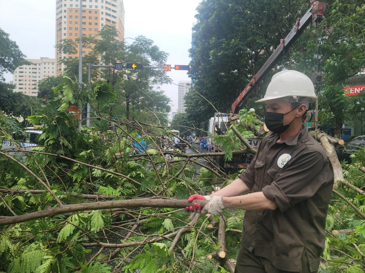 Gió lớn khiến cây phượng lớn bật gốc ngã đè lên phần kính lái chiếc xe.Vụ việc xảy ra ngay tại ngã tư đường Hoàng Đạo Thúy - Hoàng Ngân (phường Trung Hòa, quận Cầu Giấy). Cây đổ ngã chắn hết phần đường...Nhận được tin phản ánh của quần chúng, Công ty Công viên Cây xanh Hà Nội đã ngay lập tức điều người và công cụ tới hiện trường.Nhân viên Công ty Công viên Cây xanh Hà Nội khẩn trương cưa cắt.Một số công nhân thu dọn cành cây trên lòng đường.Anh Thành, 34 tuổi, nhân viên Công ty Công viên Cây xanh Hà Nội cho biết, hiện chủ xe chưa xuất hiện tại hiện trường. Nhận được tin báo, anh cùng các nhân viên khác đã nhanh chóng đến hiện trường thu dọn để đảm bảo an toàn giao thông.Thân cây sau khi cắt đã được chuyển đi.Chiếc xe bị hư hỏng phần kính lái và trần xe.Sự việc thu hút sự theo dõi của nhiều cư dân sống gần đó và người đi đường.