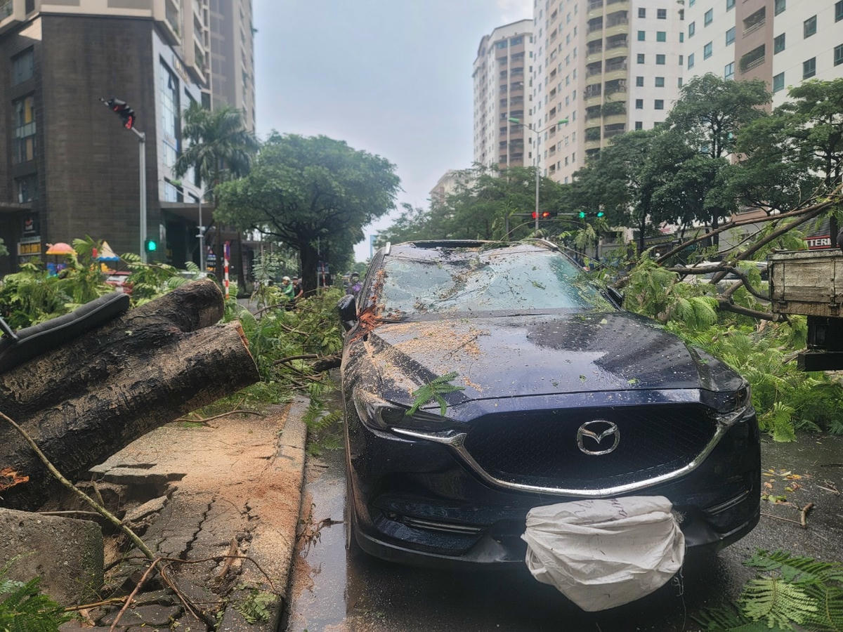 Theo ghi nhận của phóng viên Đại Đoàn Kết, tại đường Hoàng Đạo Thúy (phường Trung Hòa, quận Cầu Giấy) một cây phượng cổ thụ đã bật gốc đè lên chiếc xe ô tô hiệu Mazda BKS 30G -xxxxx.